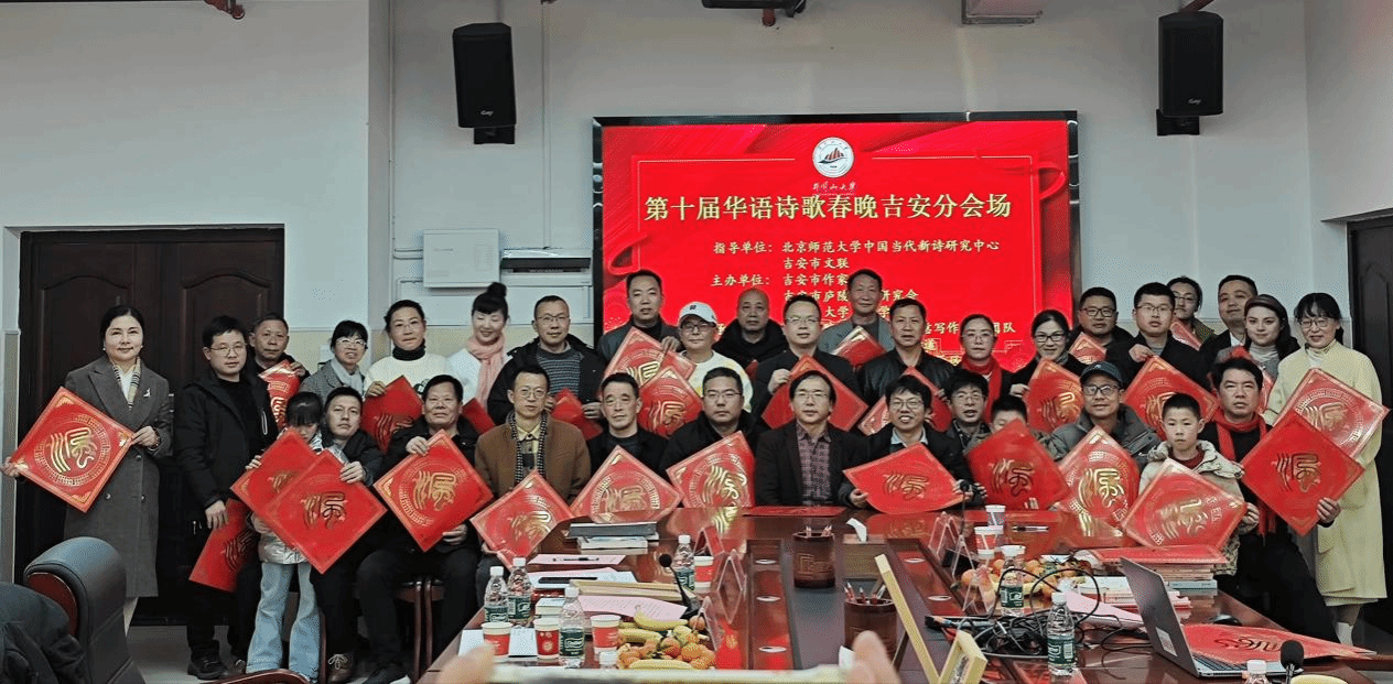 2月10日,第十届华语诗歌春晚吉安分会场在我院112会议室举行。本次活动由北京师范大学中国当代新诗研究中心、吉安市文联指导,吉安市作家协会、吉安市庐陵文化研究会、井冈山大学人文学院主办,人文学院文学阅读与创意写作省级团队、庐陵新区管委会滨江街道、人文学院露珠诗社、青原区作家协会承办。华语诗歌春晚总策划、北京师范大学中国当代新诗研究中心主任、北京师范大学教授、博士生导师谭五昌,吉安市文联党组书记、主席刘昌荣,吉安市庐陵文化研究会会长、市委政研室副主任曾绯龙,吉安市作家协会主席、井冈山大学人文学院院长龚奎林,以及吉安诗人、诗歌爱好者共40余人参加活动。