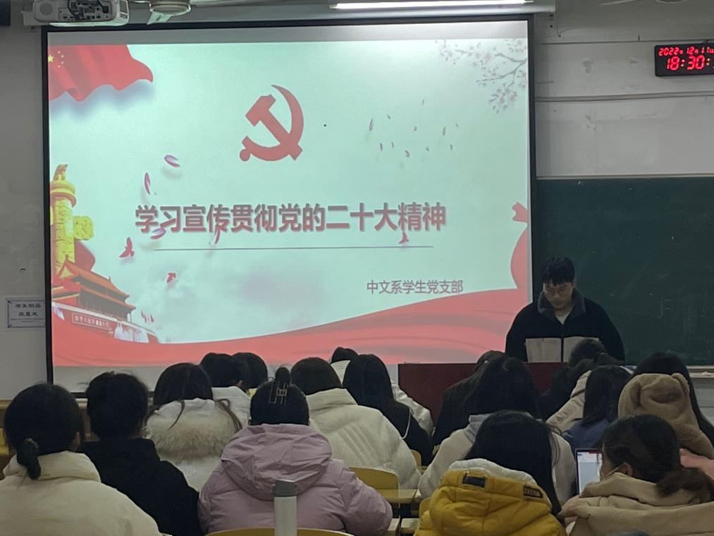 12月11日18时30分,中文系学生党支部于5栋201教室开展了以“学习宣传贯彻党的二十大精神”为主题的十二月党日活动。