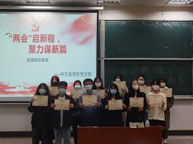 为深入学习贯彻落实“两会”精神,中文系学生党支部联合新闻传播系学生党支部于4月16日晚在五栋105室举办了以“两会启新程,聚力谋新篇”为主题的党建知识竞赛,中文系与新闻传播系党员、入党积极分子及21级同学参加本次竞赛。