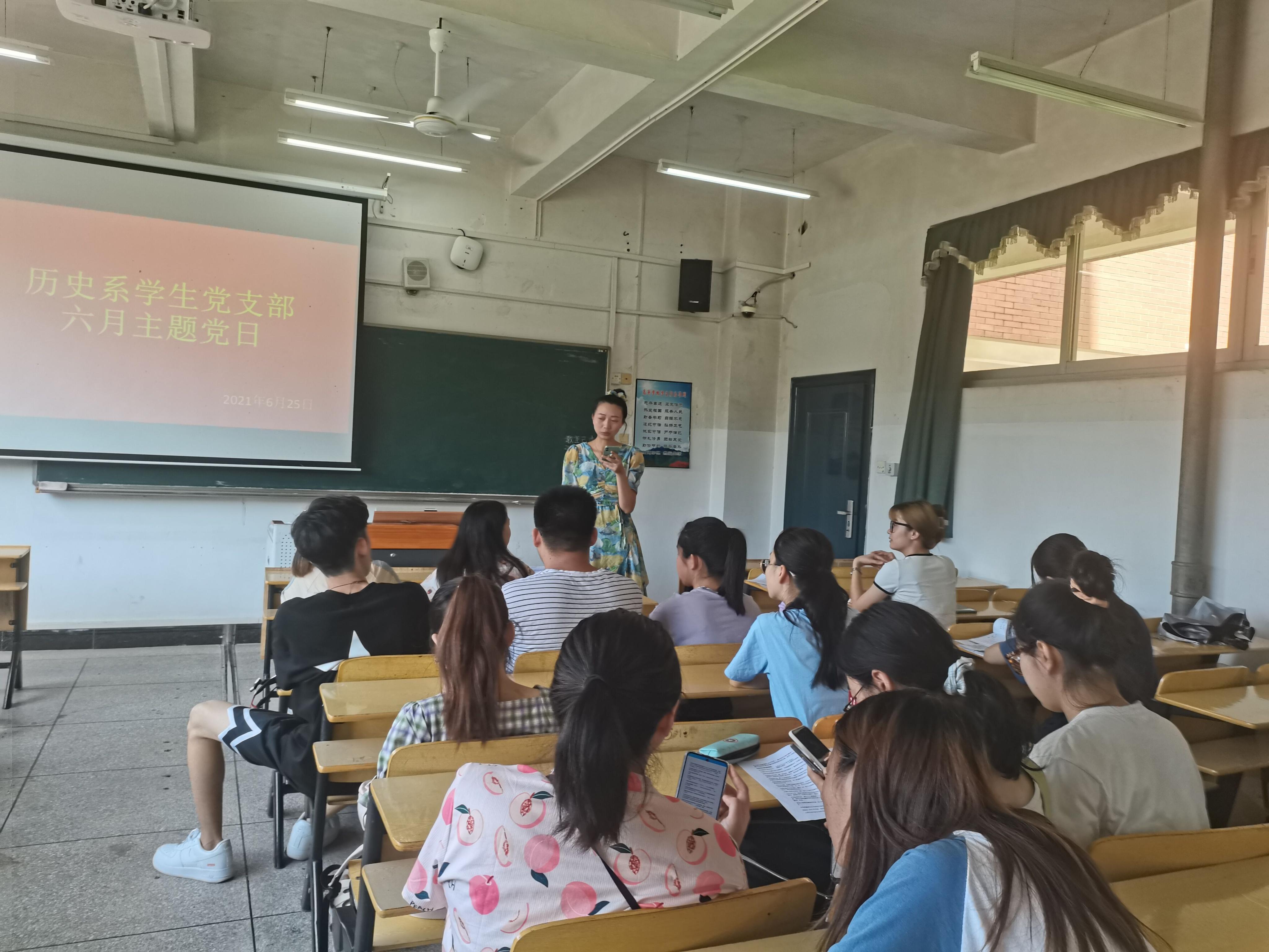 6月25日,历史系学生党支部在5栋108室开展主题党日活动。本次活动围绕着“深入推进党史学习教育,为庆祝中国共产党成立100周年营造浓厚氛围”的主题展开,历史系在校学生党员参加并进行发言。