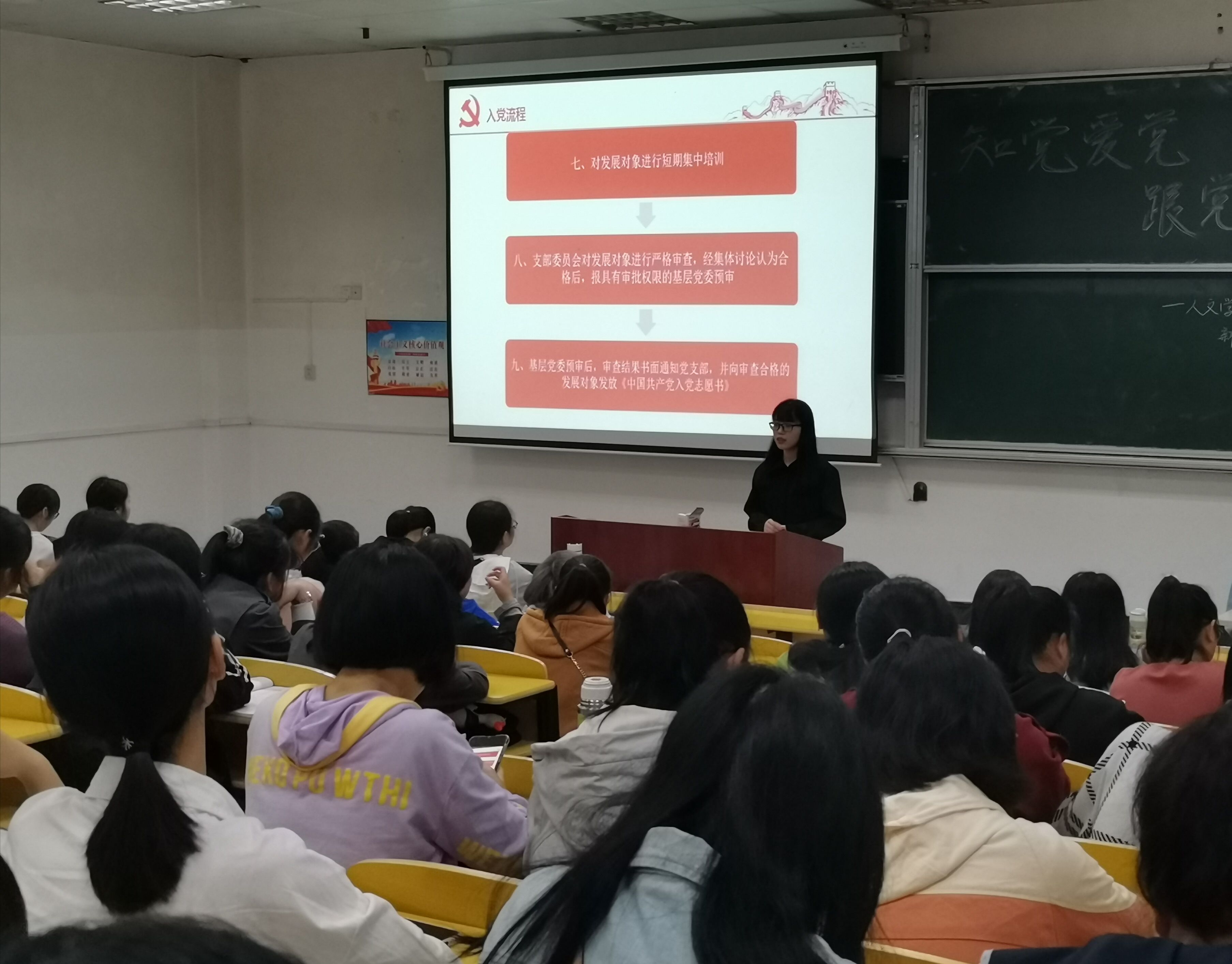 “情景剧演绎加PPT展示”的入党知识教育环节,对“什么是中国共产党”“入党的流程”“入党的条件及要求”“入党申请书的格式”等几个方面进行了详细的介绍,引导同学们要端正入党动机,努力学习,提升自己。新生们全神贯注,认真聆听并积极参与互动。在优秀党员讲党课环节,葛梦雲、熊佳琪两位同志讲述了党员在抗疫期间冲锋陷阵的事迹,陈琨璞同志讲述了为教育事业奉献一生的优秀党员张桂梅的事迹,新生们被党员们的“硬核抗疫”经历深深吸引,也被张桂梅同志全心全意为人民服务的精神和担当所打动,纷纷表示要向优秀党员学习,努力向党组织靠拢。