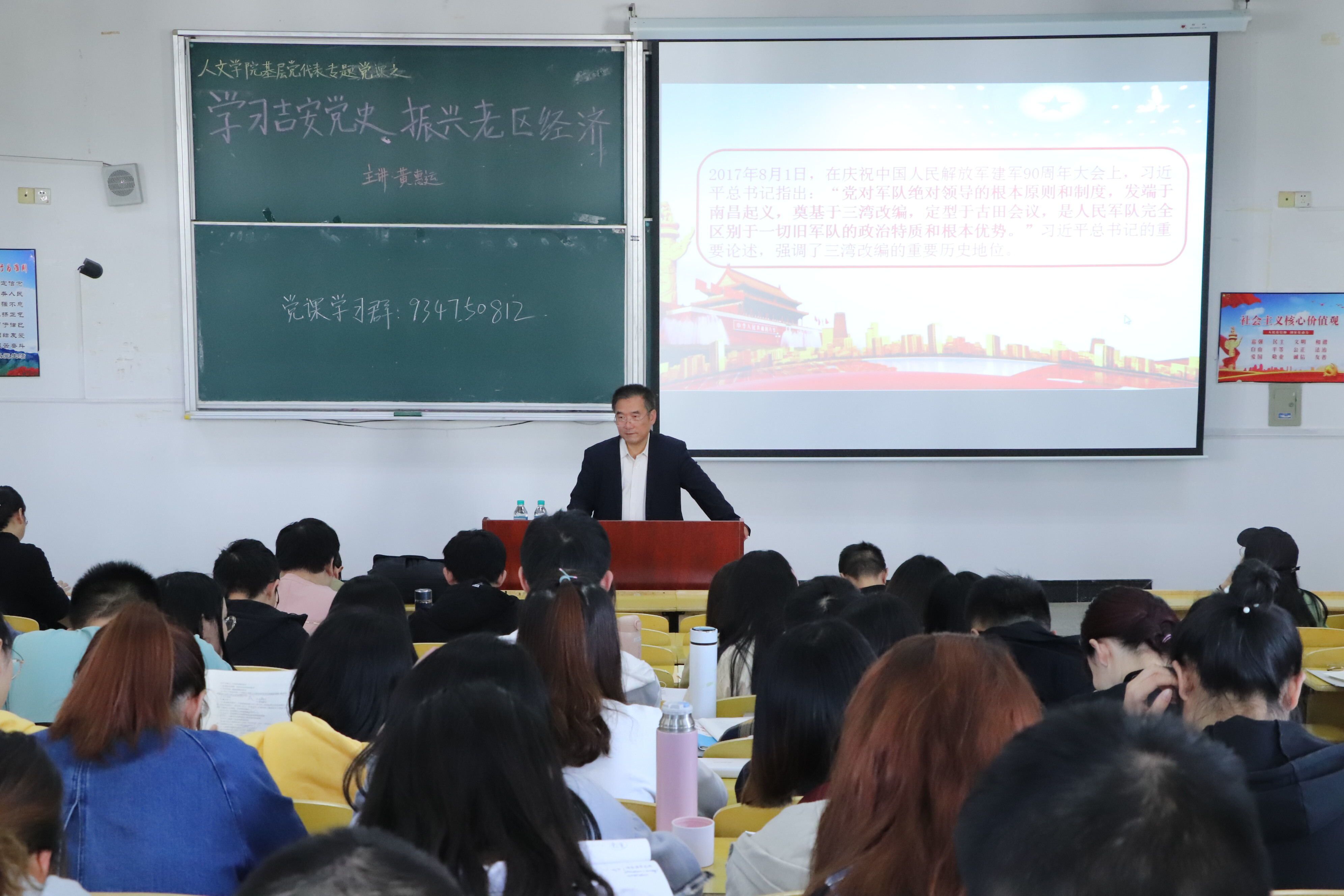 10月22日下午,人文学院于5栋307教室组织开展了基层党代表专题党课之《学习吉安党史,振兴老区经济》活动。本次专题党课由我院历史系黄惠运教授作党课主讲人,人文学院党委书记康永参加并主持本次活动。学院部分师生党员、发展对象及入党积极分子、学生代表共计150余人参加此次党课活动。