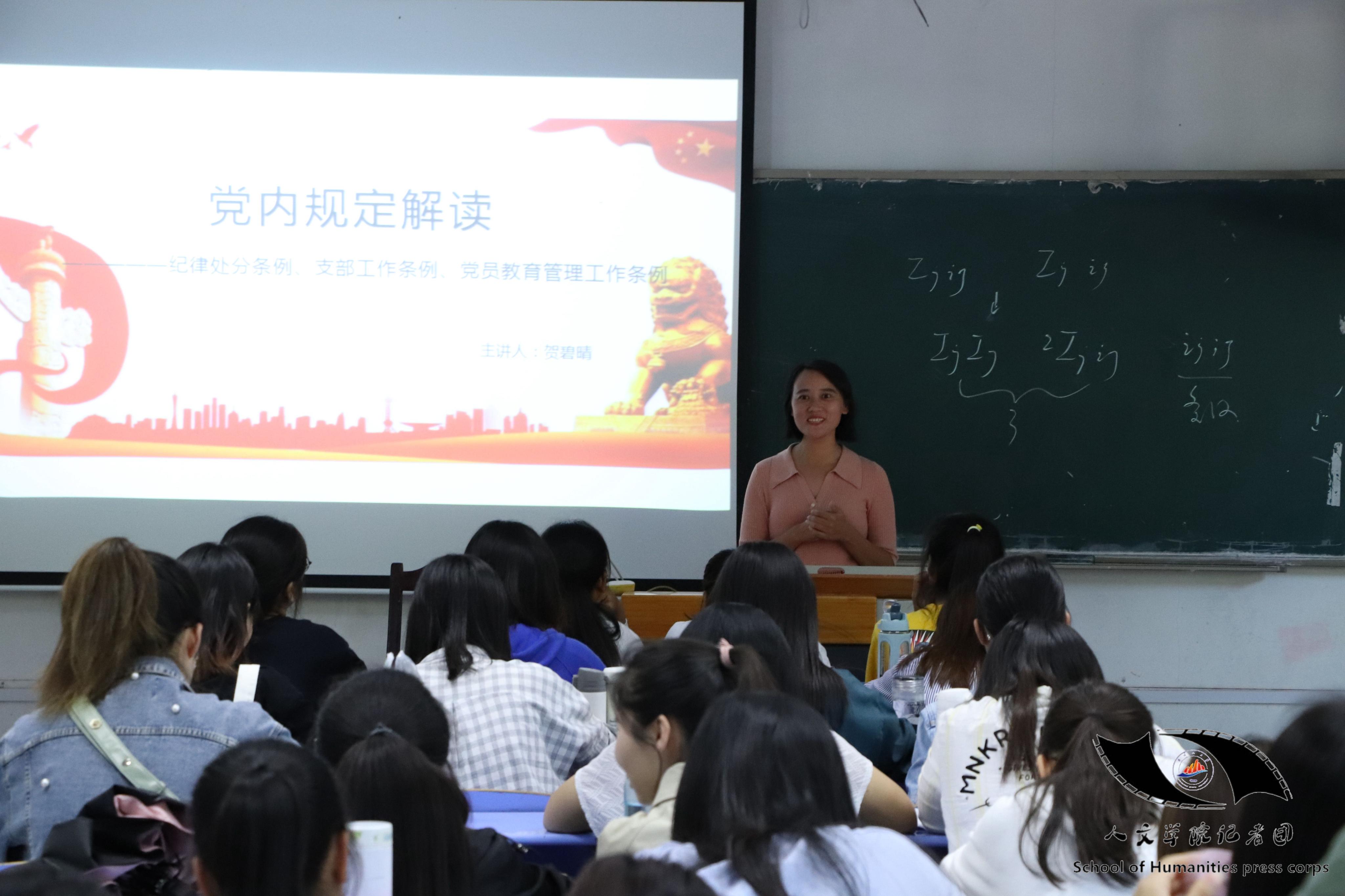 10月21日下午,人文学院于五栋107教室举行“党内规定解读”党员集中培训宣讲活动。本次活动由新闻系学生党支部书记贺碧晴主讲,付闯主持。学院部分师生党员、发展对象及入党积极分子参与。