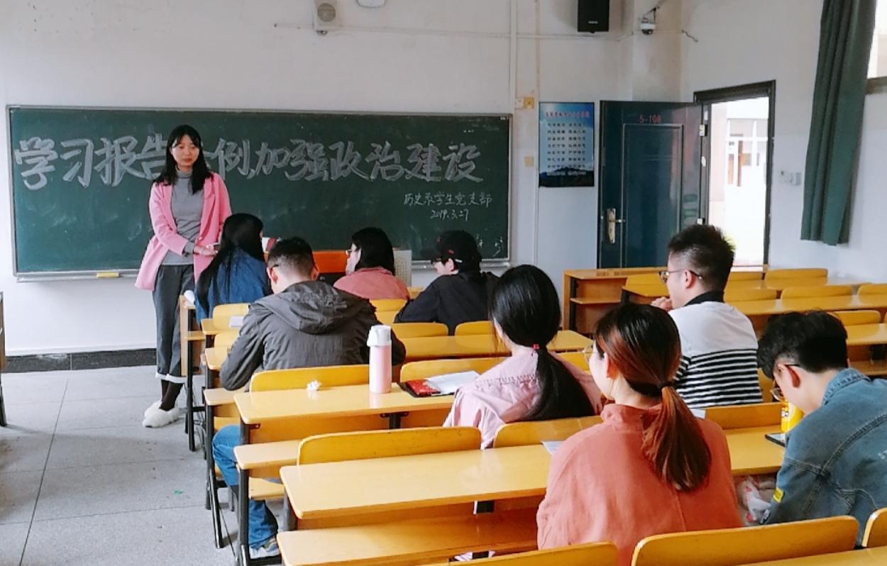 人文学院历史系学生党支部于2019年3月27日中午12:30在五栋教学楼108室开展了以“学习报告条例,加强政治建设”为主要内容的组织生活会,同时进行了民主评议党员。本次会议的主持人是支部书记戴梦雅,历史系除请假的毕业班党员外,在校学生党员全部参与了本次会议。