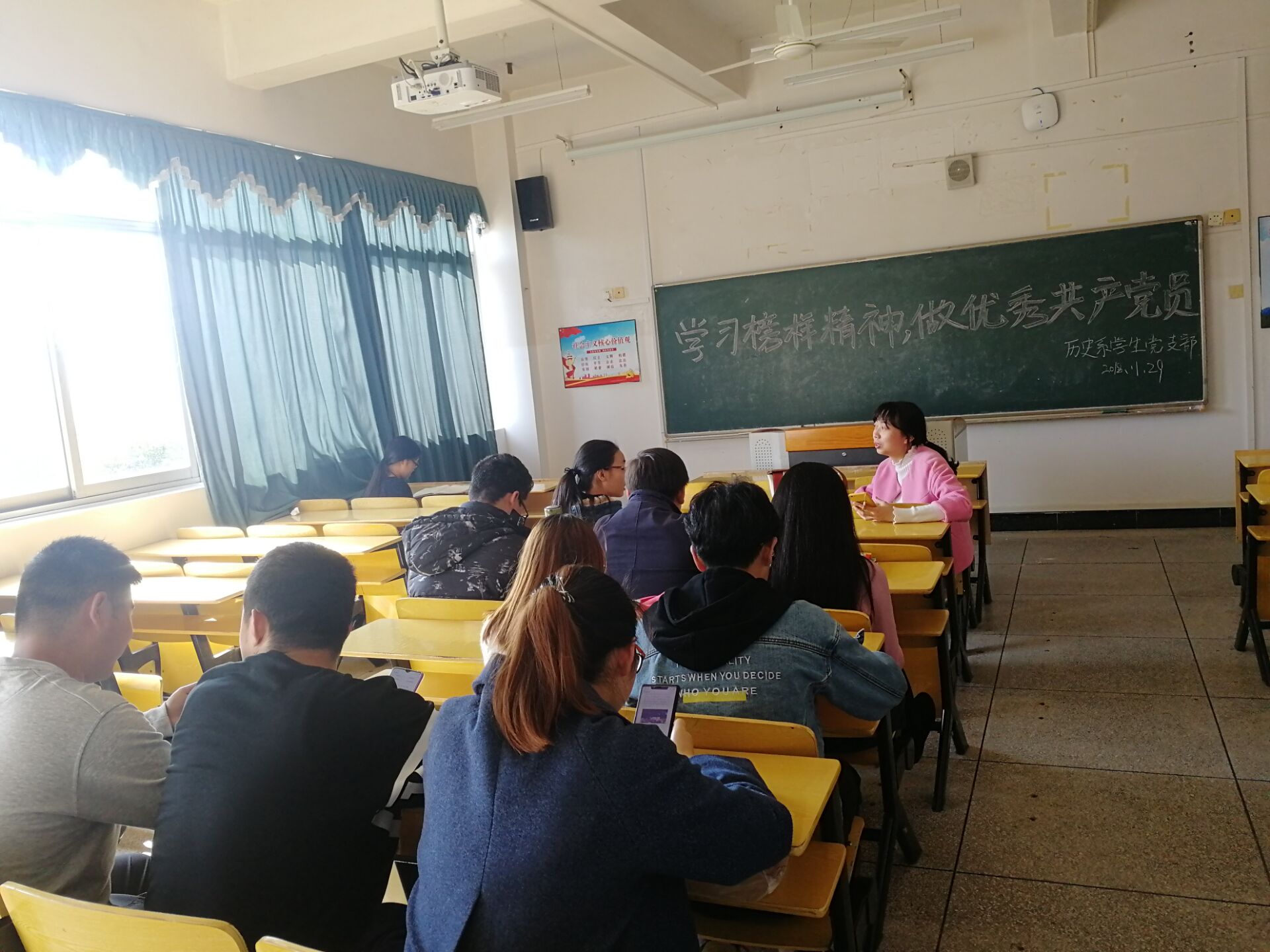为了响应习近平总书记关于向“时代楷模”黄群、宋月才、姜开斌、王继才同志学习的号召,2018年11月29日中午,历史系学生党支部在5栋109开展了主题为“学习榜样精神,做优秀共产党员”的党员活动日活动。