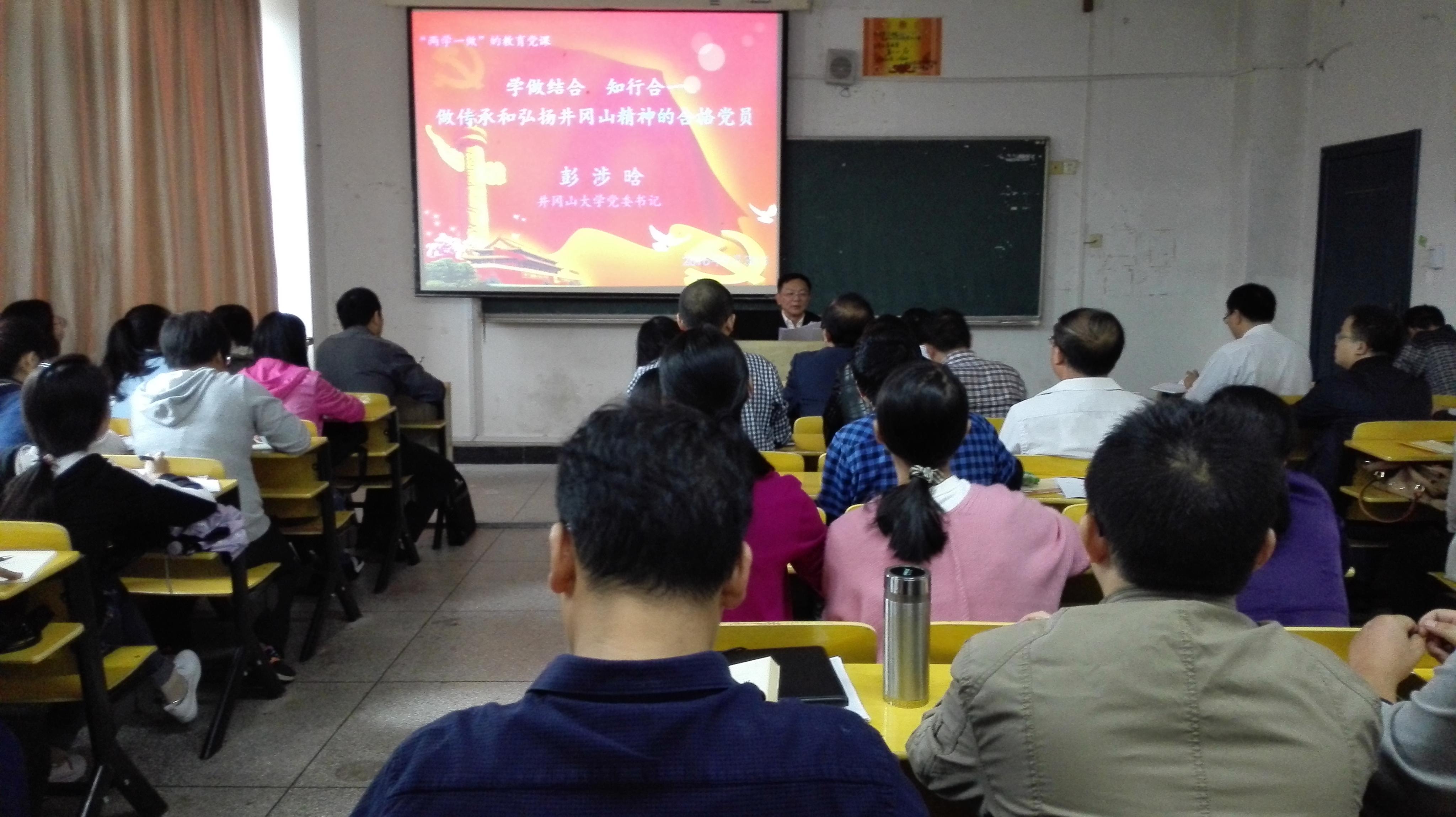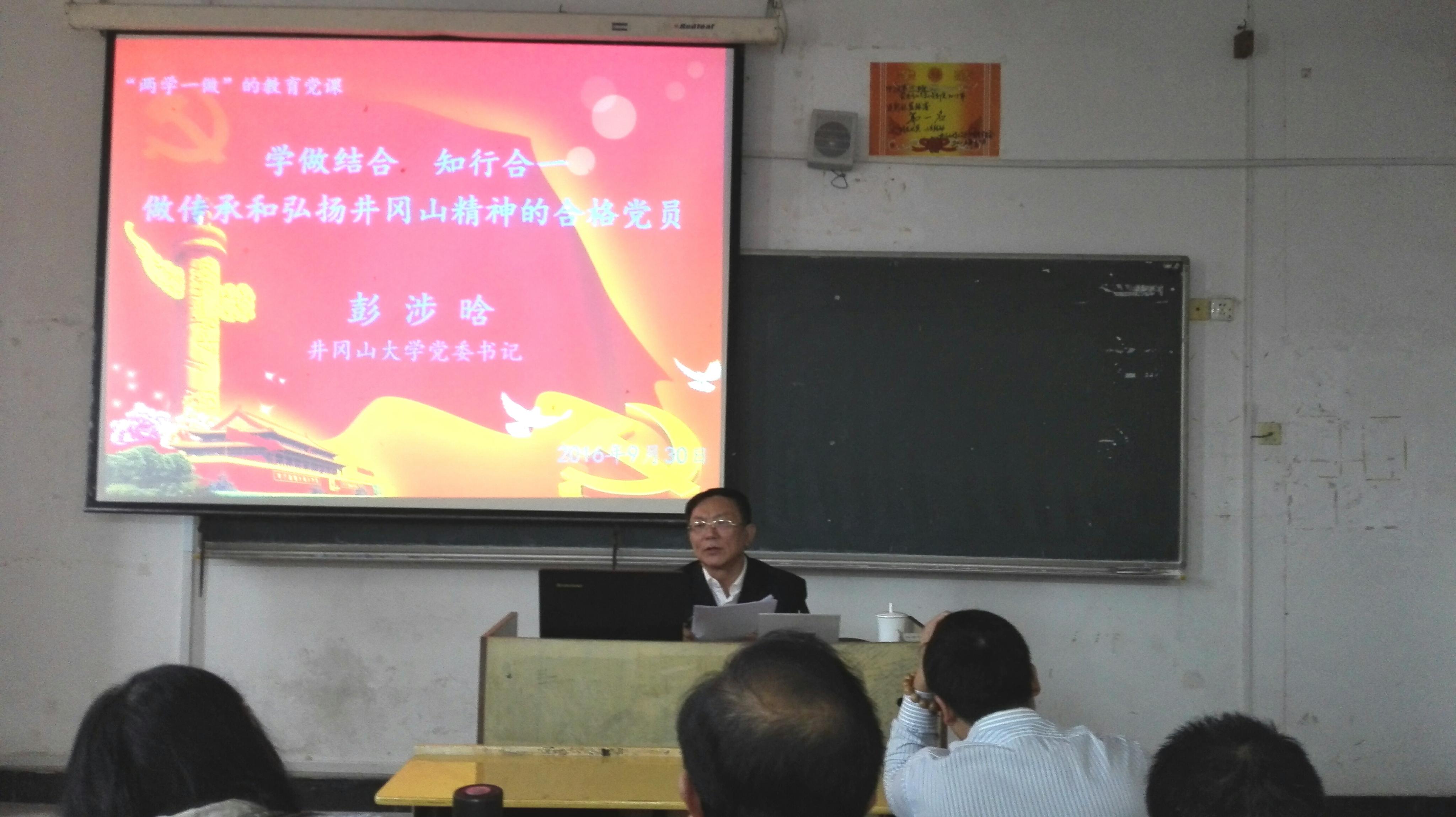 9月30日下午,学校党委书记彭涉晗围绕“两学一做”学习教育,以“学做结合,知行合一,做传承和弘扬井冈山精神的合格党员”为主题,为人文学院全体师生党员上了一堂精彩的党课。人文学院党委书记欧阳杰主持。
