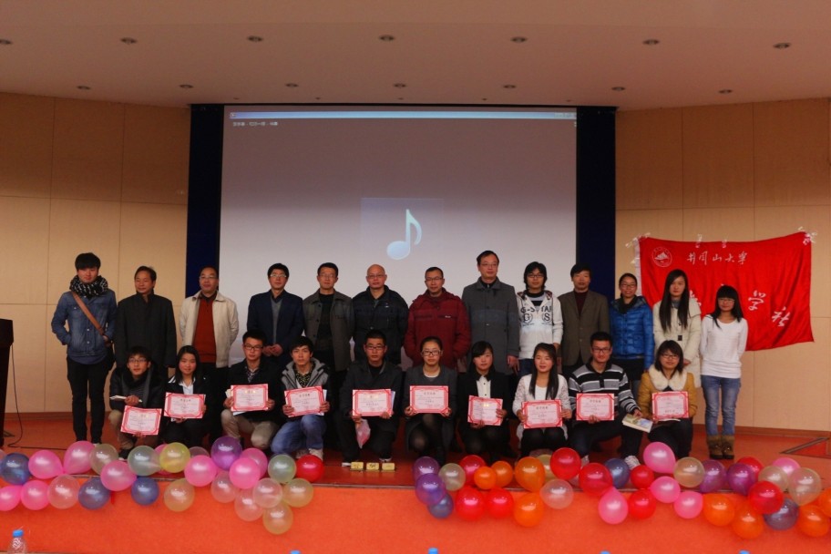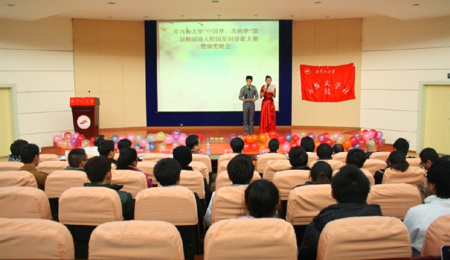 雨吟阵阵颂诗情,丝竹声声流雅韵。12月16日晚,由吉安市诗歌协会主办,雨丝文学社、人文学院中文系党支部联合承办的“中国梦、我的梦”井冈山大学第二届“桂冠诗人”校园原创诗歌大赛颁奖晚会在十栋学术报告厅隆重举行。校团委书记李泉,吉安市文联副主席、吉安市作协主席曾绯龙,中国作协会员、吉安作家协会副主席、吉安市诗歌协会会长、著名诗人胡刚毅,吉州区文联主席、吉安市诗歌协会副会长刘英敏,吉安市诗歌协会副秘书长、诗人欧阳河,人文学院中文系学生党支部书记郭若虹、教师汪剑豪、曾纪虎,雨丝文学社指导老师龙安隆,全国包商杯大学生诗歌大赛三等奖获得者、青年诗人刘理海,大通社、《学生之家》编辑部、大学生记者团等50多个社团主要负责人出席,全校400余名学生观看了本次晚会。