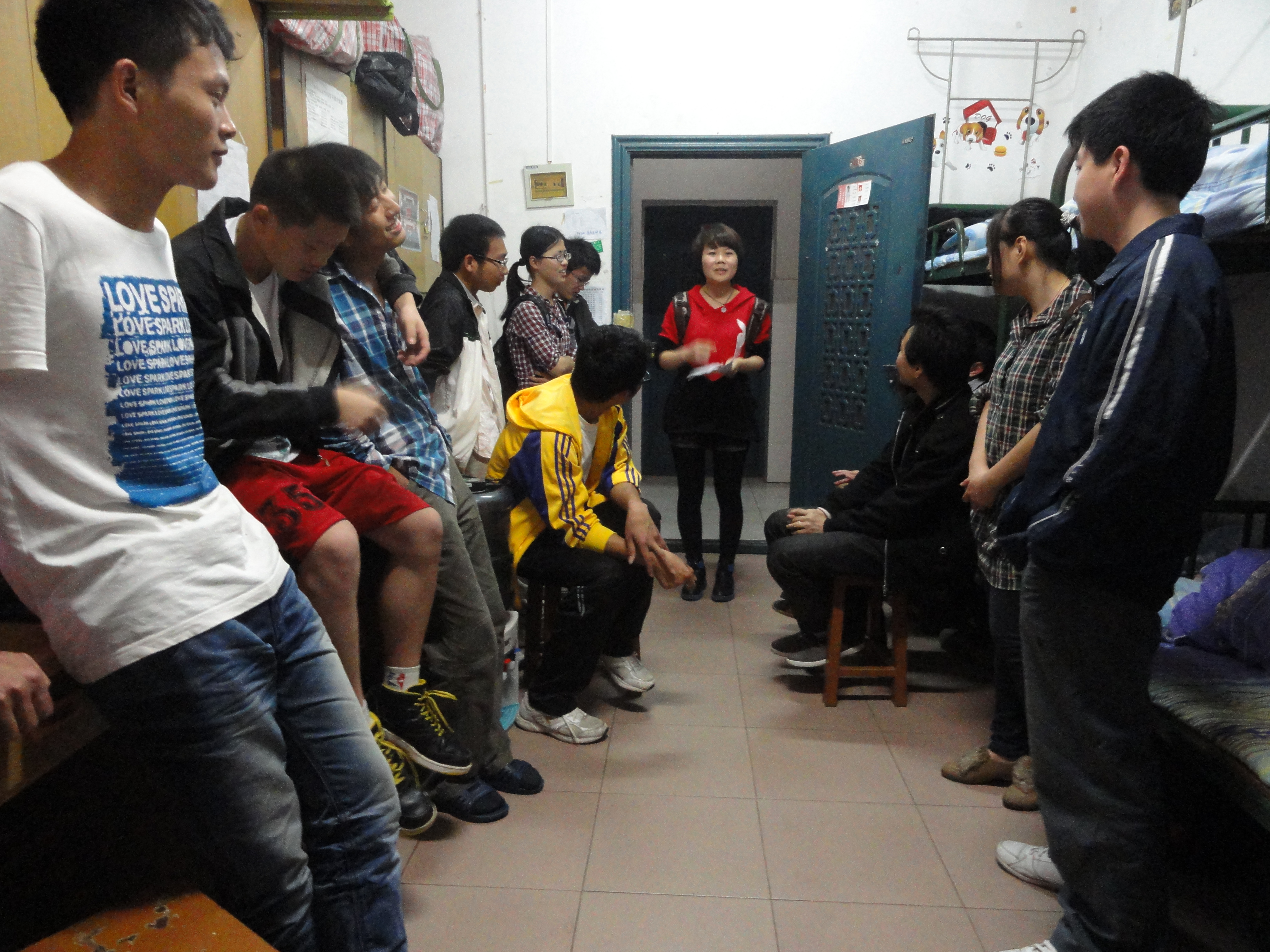 晚七点,党员们纷纷来到四楼的11级历史班男生寝室。轻轻敲门,在得到允许声之后。各党员一一走进寝室,一番仔细观察后,党员万丹丹对学弟们的饮食起居进行了询问。11 历史本一班班长张莉斌热情地招个呼各位党员坐下,而后又将班上的其他同学一同叫到了426寝室。整个寝室,一时间到处都挤满了人。一开始,气氛比较尴尬,在各位学长、姐一一做自我介绍后,大家的话才开始多起来。从有关入党的相关问题聊到课堂学习,从课后的寝室生活到未来的梦想,寝室中不时发出一阵的笑声,犹如一个大家庭般,那么的和谐,有说有笑。