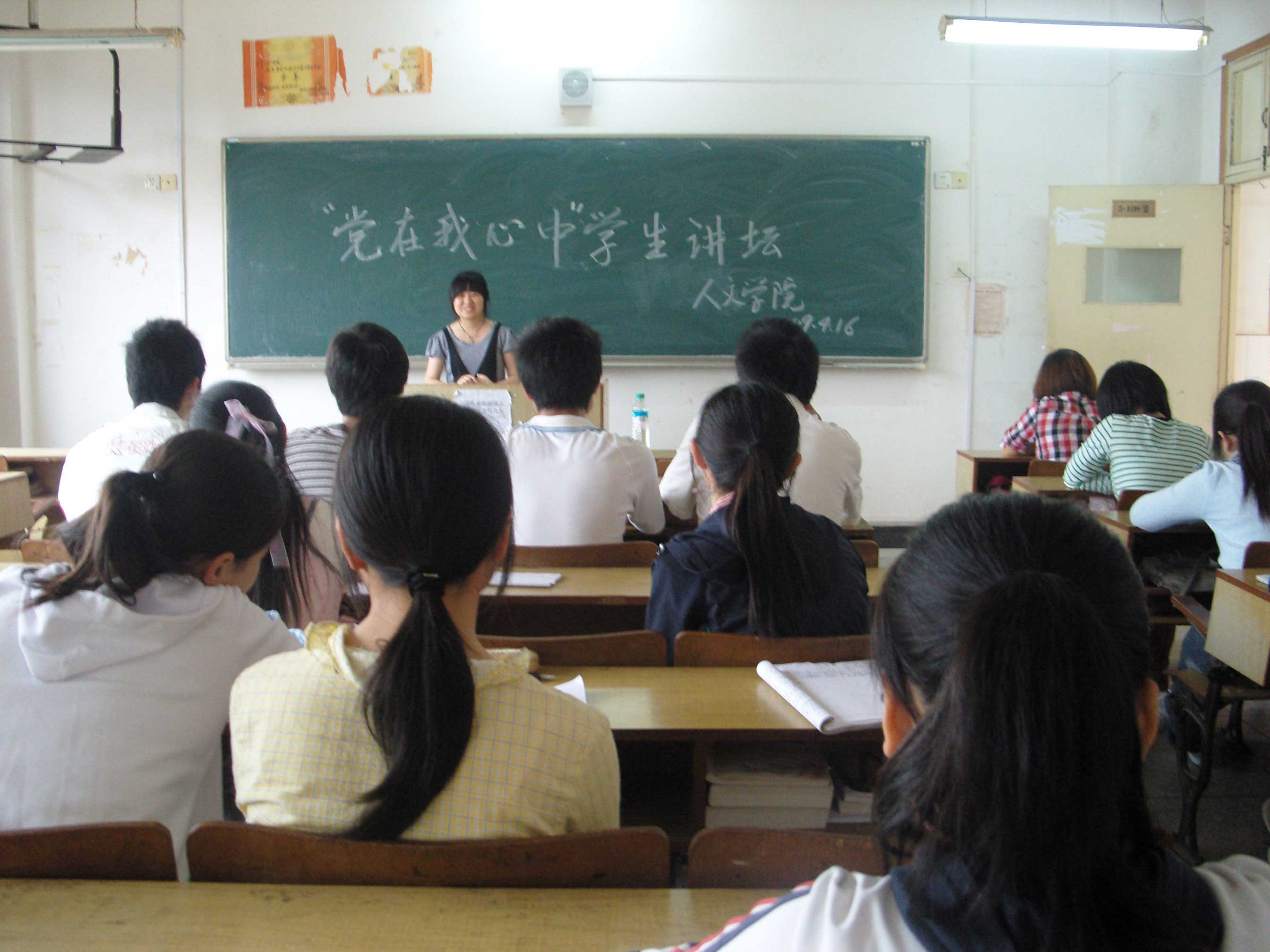 4月16日下午2:30,我院中文系第二学生党支部书记郑建军在5栋108教室组织了一次“党在我心中”学生讲坛活动。本次活动的主要目的是深化对党的与体会认识、促进对党的热爱与追求。08级各班入党积极分子参与了此次讲坛。