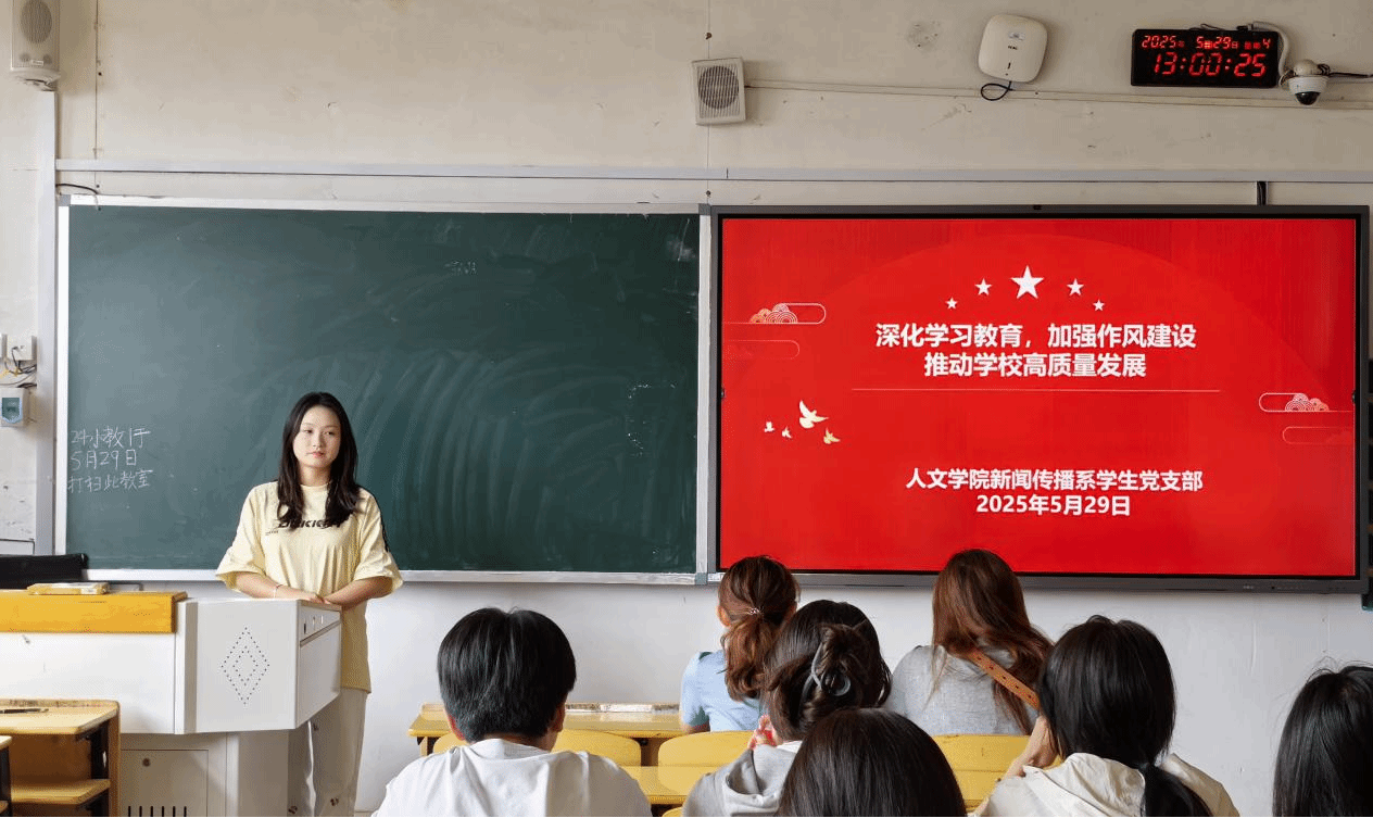 新闻传播学系学生党支部于5月29日下午在5栋305教室开展了以“深化学习教育,加强作风建设,推动学校高质量发展”为主题的5月党日活动,本次活动由党支部书记陈玉萍主持,全体学生党员参加。