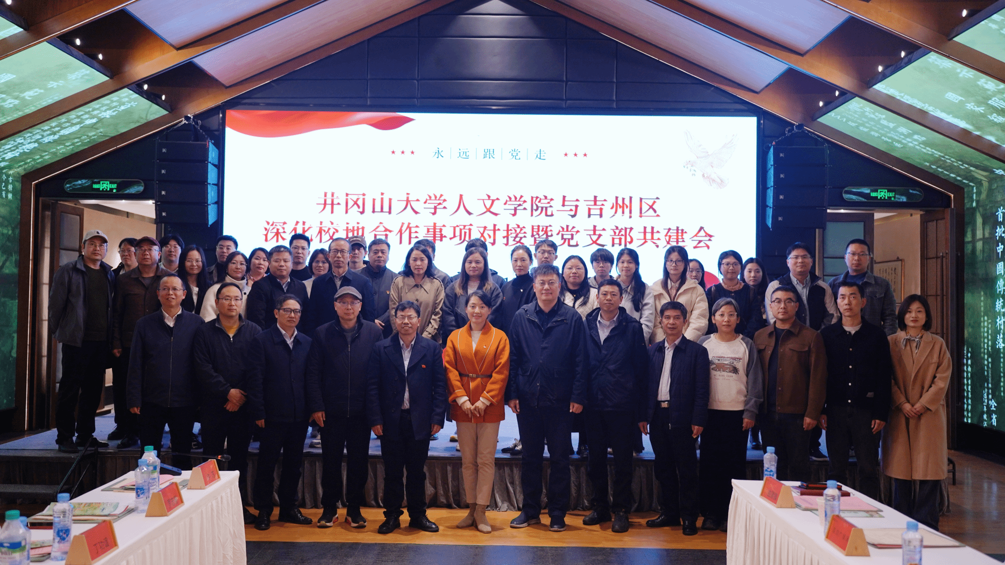 会议现场,“井冈山大学人文学院社会实践基地”揭牌仪式隆重举行,红绸落下标志着校地合作从意向阶段走向实体落地,正式迈入常态化运作新阶段;与此同时,人文学院相关党支部与吉州区对应党支部完成结对,这一举措成为“党支部建在项目上”的重要实践,为党员投身校地合作一线搭建起坚实的组织平台。