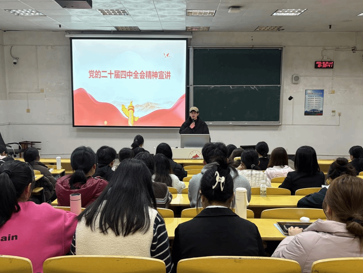 为深刻领会党的二十届四中全会精神的核心要义,明确党员实干路径,践行党员的精神使命。中文系学生党支部于12月10日在5-105教室开展了以“学习贯彻党的二十届四中全会精神”为主题的十二月专题党课。