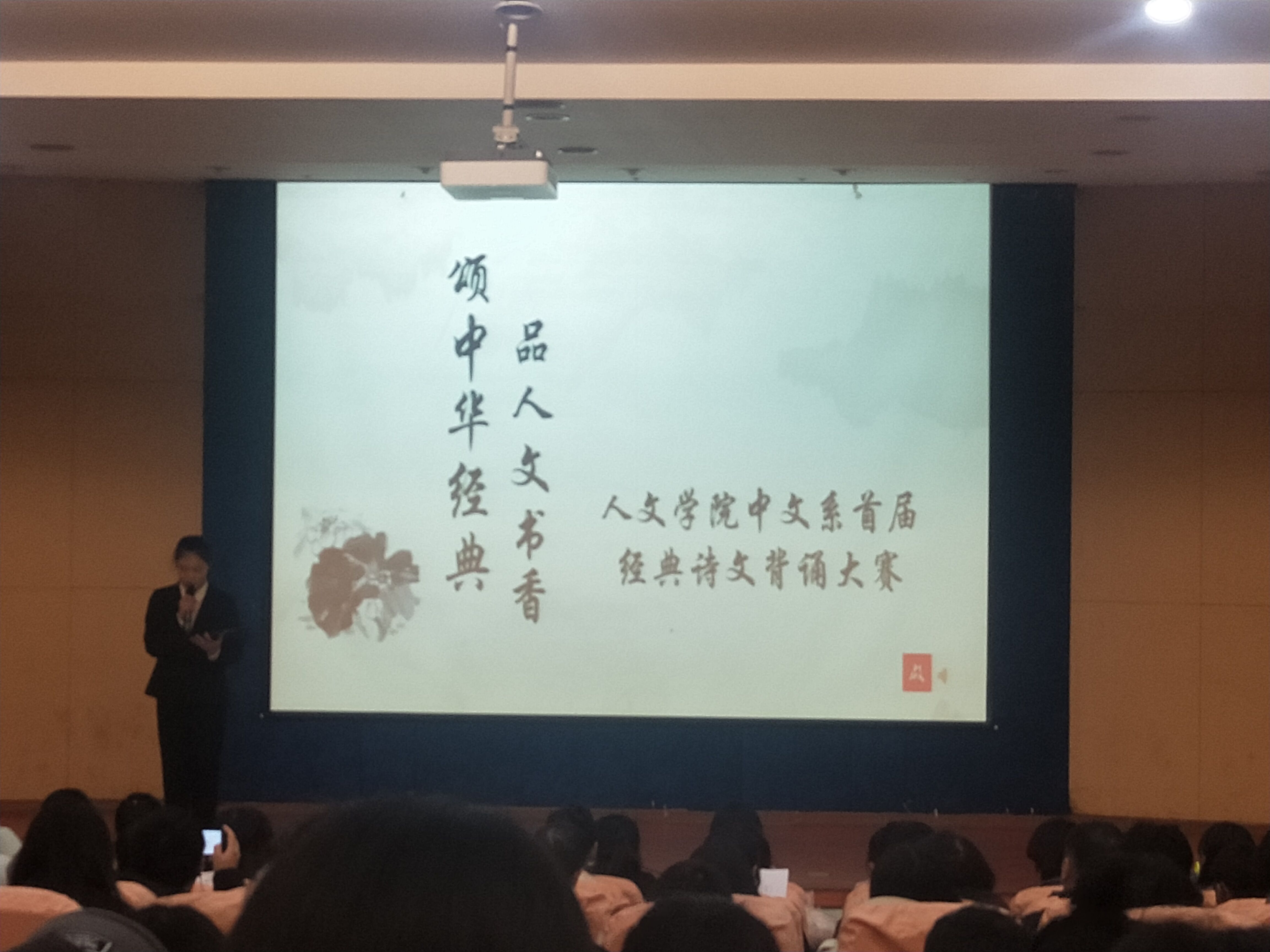 为了将泱泱文明根植菁菁校园,将千古诗文传于莘莘学子,使大学生会晤华夏圣贤、文豪诗杰,在古韵芳华中传承文明、提高修养,感悟快乐、收获成长,12月7日18:30,人文学院中文系首届经典诗文背诵大赛在10栋学术报告厅隆重举行。