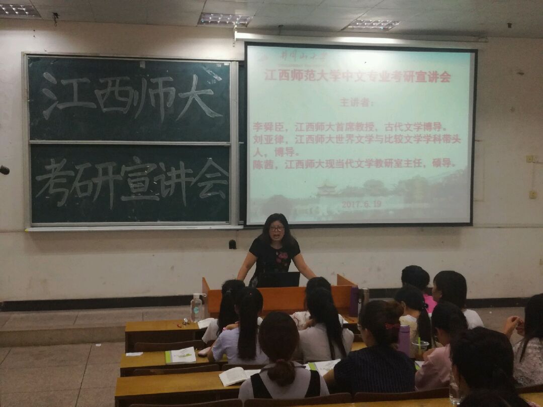 为了推动汉语言文学、汉语国际教育专业学生的考研成功率,让学生充分认识考研对提升学习效率的重要性,江西师范大学首席教授、中国语言文学一级学科博士点负责人,古代文学博导李舜臣教授、江西师大世界文学与比较文学学科带头人、博士生导师刘亚律教授、江西师大现当代文学教研室主任、硕导陈茜教授,于6月19上午9:00在我院5教104教室举办了江西师范大学中国语言文学专业考研宣讲与指导会,院长刘晓鑫教授、党委书记欧阳杰教授、副院长邓声国教授会见了李舜臣教授一行,我院100余名师生参加了考研宣讲会。