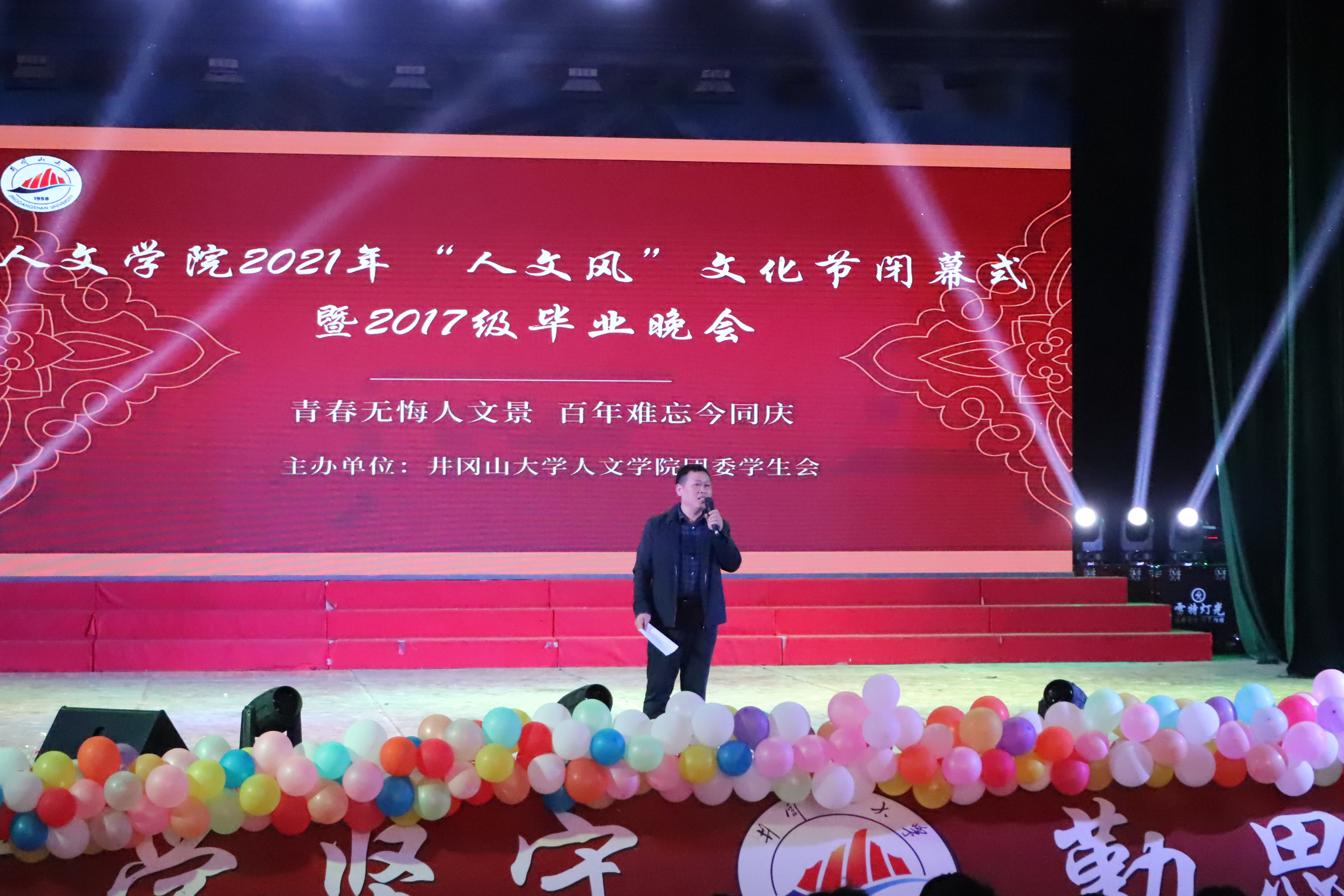 本场晚会的主持人由17新闻1班章钰清、17广电张丁元、17汉语言2班陈啸东、17汉语言3班许雅琴、17外汉班熊婧阁、20编导1班杨小童担任。六位主持人在宣布毕业晚会开幕之后,介绍了到场的人文学院的领导:院长刘晓鑫、院党委书记康永、副院长龚奎林、院党委副书记张华、院团委副书记戴梦雅、院团委负责老师陈灵婧以及17级各毕业班班主任。