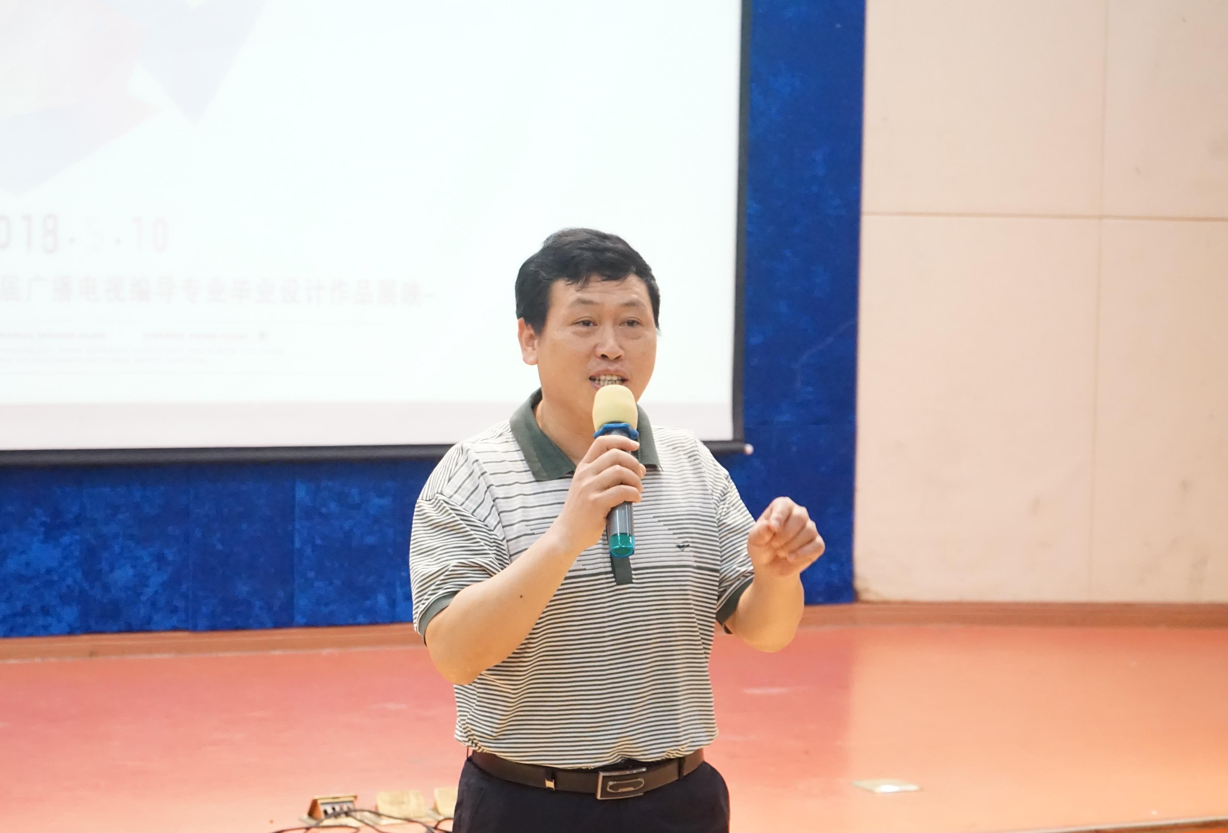 所有影片放映结束后,14级编导班负责人肖文老师上台进行讲话。他对编导班的毕业生们进行了鼓励,他说自己看到了同学们的成长。随后他对所有的影片进行了点评。并指出了每部作品的长处与不足,给同学们提出了一些建议。