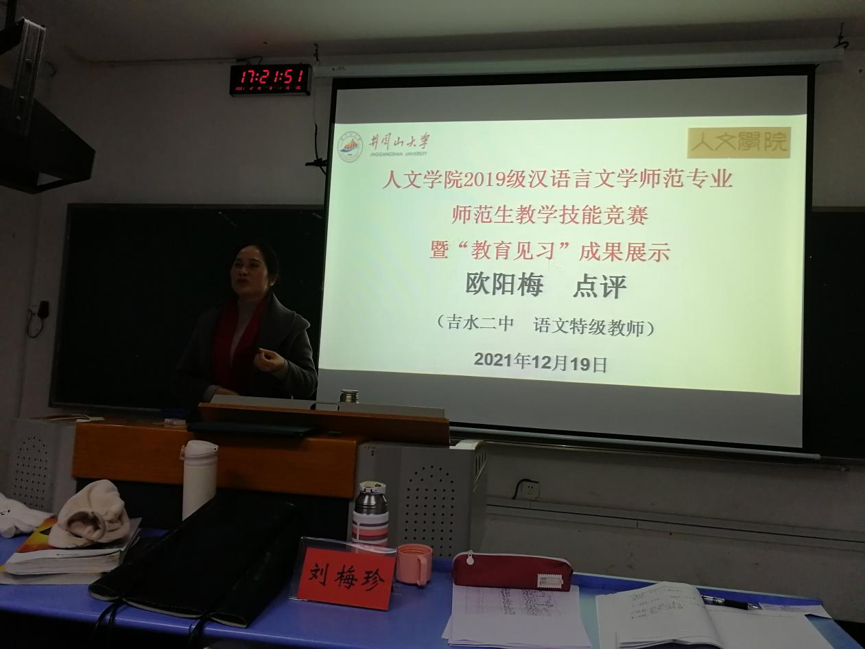 汉语言文学专业负责人陈冬根副教授亲临现场指导并做评委,莅临本次比赛的评委还有“教育见习”指导老师刘梅珍、来自吉水二中的语文特级教师欧阳梅和吉安十三中的刘娟2位汉语言文学专业外聘老师。本次比赛由人文学院中教法教研室组织、人文文学师协协助举办。