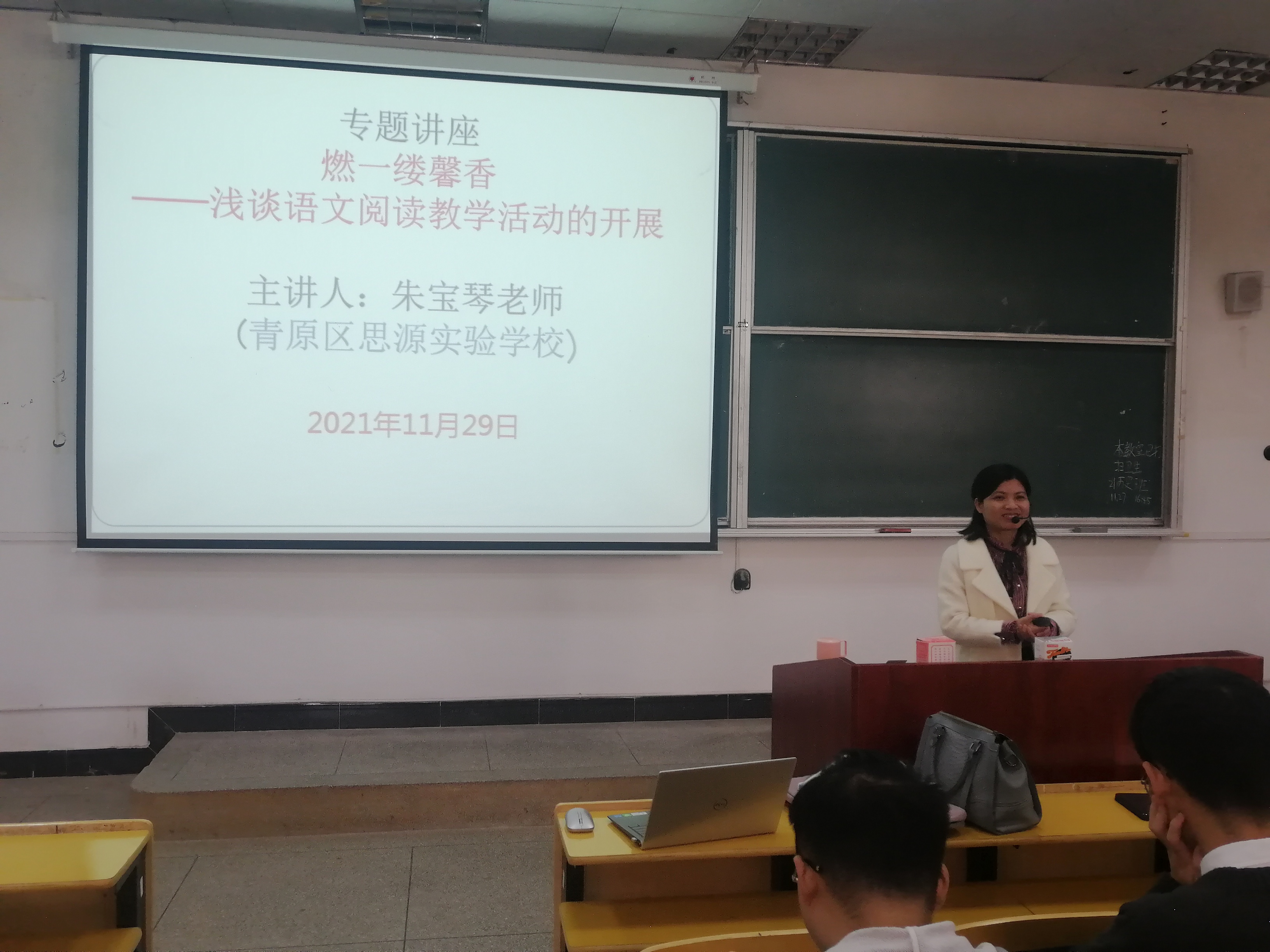 11月29日青原区思源实验学校朱宝琴老师做专题讲座《燃一缕馨香——浅谈语文阅读教学活动的开展》。讲座起始,朱老师引导师范生们思考阅读教学的影响要素。基此,朱老师围绕教学内容的确定和教学方法的选择两大问题加以开展。关于教学内容的确定,朱老师从”教什么“与”为什么教这些“两个层面加以分析。对于”教什么“,朱老师首先强调全面透彻地解读对确定教学内容的重要性,并指出需要从写什么、怎么写和为什么写即内容、写法和主旨三个方面对文本加以解读。关于“为什么教这些”,朱老师总结了确定教学内容的相关依据,如课程性质、阅读特质、文体特点、学生情况等。关于教学方法层面的“怎么教”,朱老师认为,首先要强化生本意识。教师需要改变以教师主导为主的教学模式,教学的设计与开展要重视学生的主体性,引导学生以自主、合作、探究的学习方式进行学习。其次,要选择合宜的教学方法。教学方法的选择可从比较的视角、朗读的方式、过程的体验、现场的生成等方面来加以考虑。朱老师在整个讲座过程不时地结合相关的中学语文教学课例加以具体地解说,深入浅出。