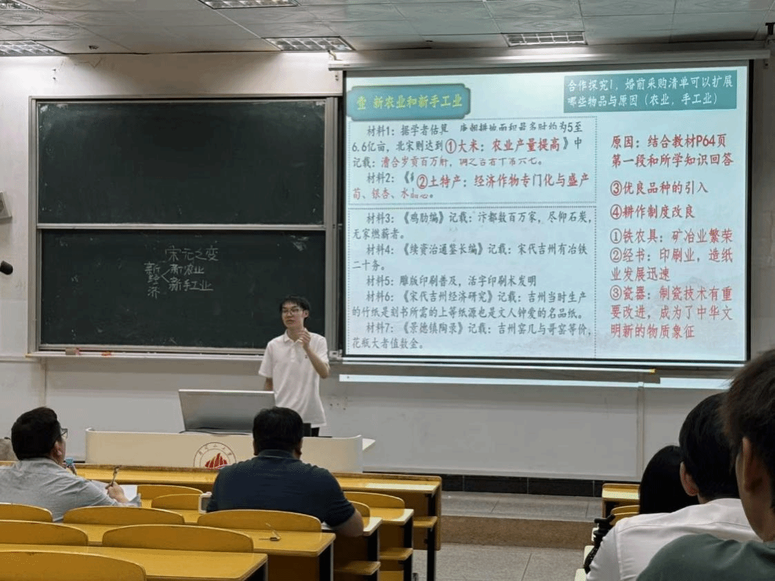 共13位同学展示了各自的授课内容,三位评委对每位同学的授课都进行了精彩的点评,本次比赛还出现了两组同课异构现象,分别是孟诺冰(23级历史)与杜家俊(24级历史)的《两宋的政治和军事》,黄佳慧(23级历史)与周静茹(24级历史)的《五四爱国运动》,通过评委们的点评,同学们体会到了对同一主题,不同教师在内容理解和教学方法上的不同,感受到了师范教学的精妙。