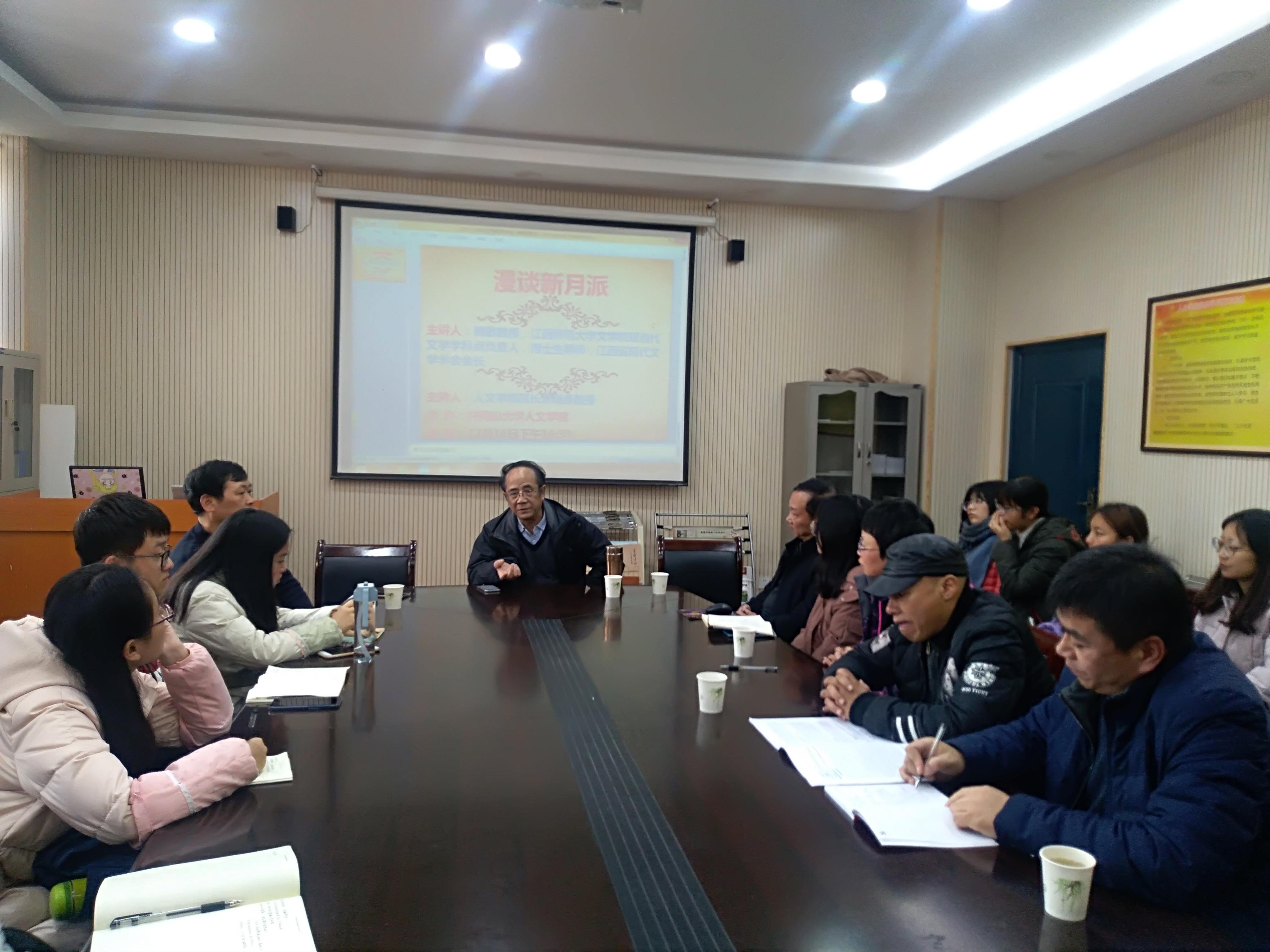 2018年12月16日14:30,江西师范大学文学院现当代文学学科点负责人、博士生导师、江西现代文学学会会长颜敏教授应邀来人文学院开展“漫谈新月派”的学术讲座,并指导学科建设和国基申报。人文学院院长刘晓鑫教授主持了讲座,龚奎林副院长、学科教师廖伦忠、赵庆超、马玉红、郑乃勇、马建珠等以及17级汉语言专业的部分同学参加。