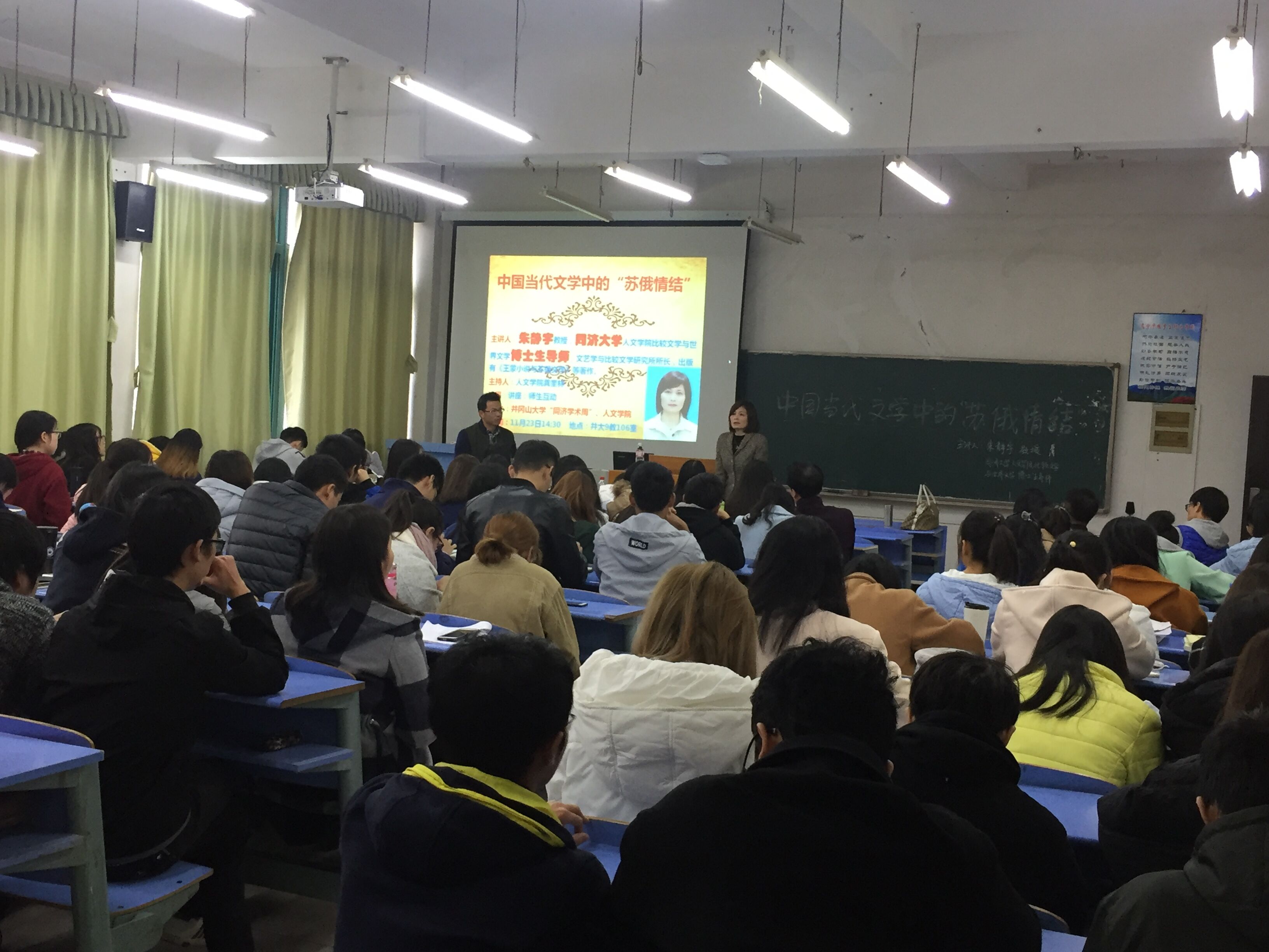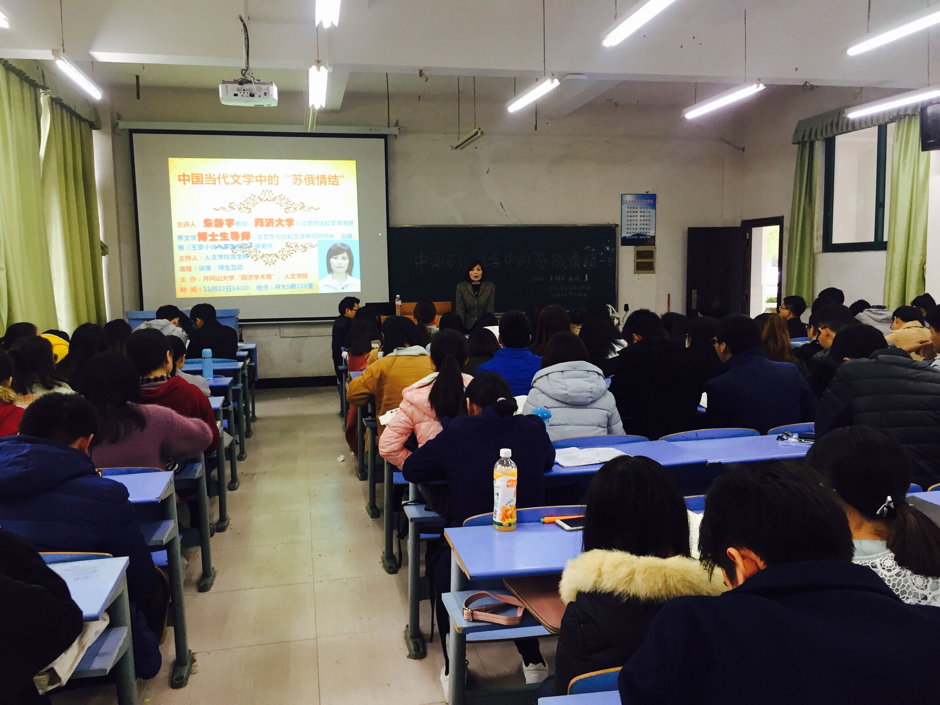 2017年11月23号下午2:30,同济大学人文学院朱静宇教授应邀来我院参加“同济学术周”活动,并在9教106教室作了一场题为“中国当代文学中的苏俄情节”的学术报告,报告会由中文系副主任龚奎林博士主持,15级中文系所有学生及16级中文系部分学生200多人听讲。
