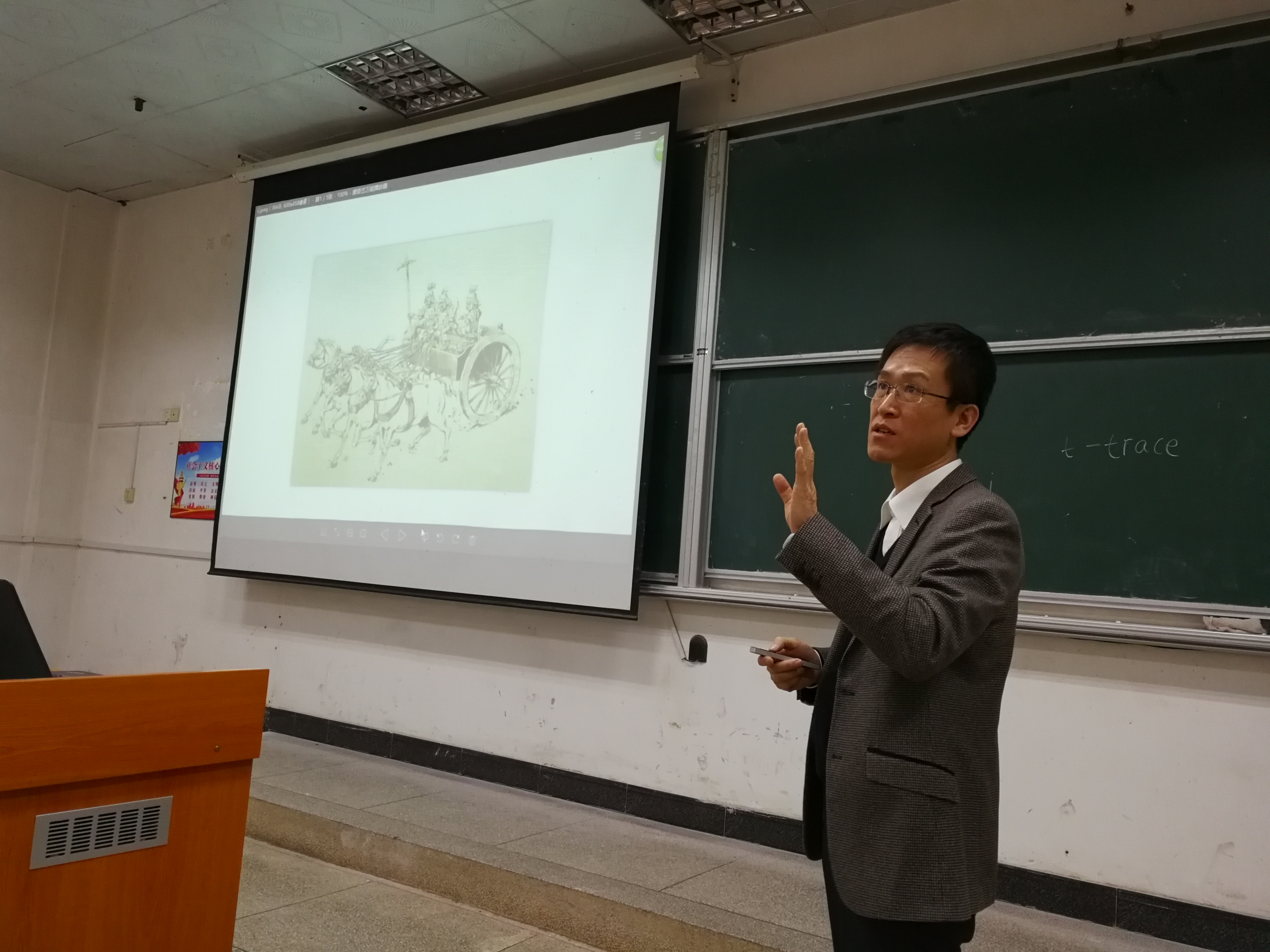 11月24日上午,同济大学人文学院邓军副教授给我院师生上了一节“古代汉语”示范课,讲课的内容是文选《子路曾皙冉有公西华侍坐》,中文系、新闻系和历史系师生一百余人听课。邓军老师在课堂上介绍了孔子及《论语》,串讲了课文,重点讲解了课文中的文言词语和句式,品析了人物形象,并且分析了孔子“礼乐治国”的政治思想和教育艺术。邓军老师教学经验丰富,课堂掌控能力强,课件制作精致,语言生动有趣,注重师生互动,充分展示了同济教师的风采。课后,部分师生和邓军老师在现场进行了进一步的交流。
