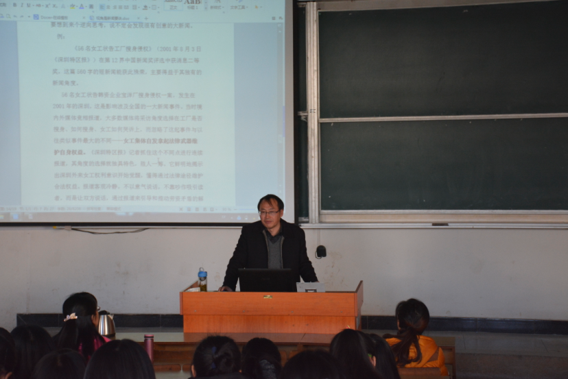 为了加强学界与业界的沟通融合,提高新闻传播专业学生的业务技能,12月17日下午3时,《井冈山报》副总编辑冯云生在五栋205教室举办《视角是新闻要诀》的专题讲座。新闻系教师梁长荣、徐桂林、温凤鸣以及13、14级新闻和广电专业的同学参加讲座。