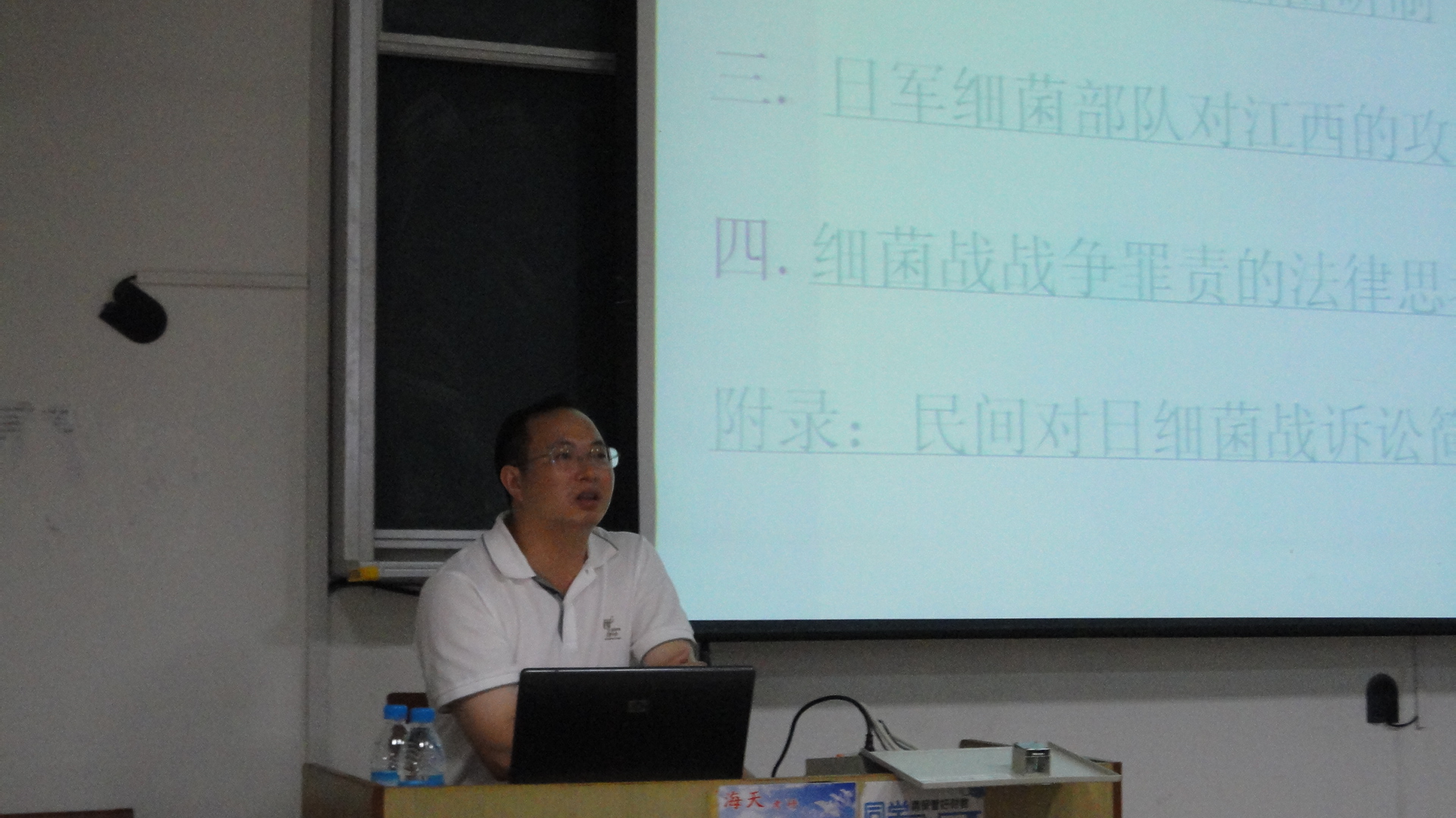 6月14日晚,应人文学院历史系邀请,江西省社联副主席吴永明教授来我校作了题为《侵华日军细菌战及其战争罪责研究》学术报告。人文学院师生共同聆听了报告。