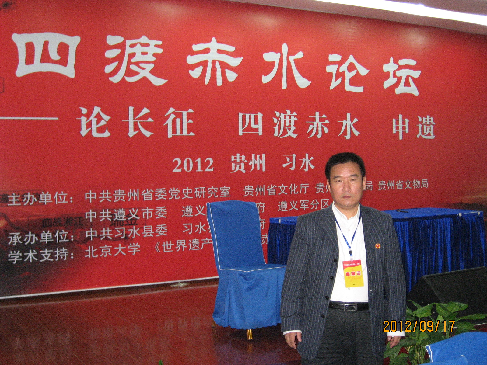 2012年9月16日、17日,由中共贵州省委党史研究室、省文化厅、省旅游局、省文物局、中共遵义市委、市人民政府、遵义军分区主办,习水县委、县政府、县人武部承办,北京大学、四渡赤水纪念馆等为学术支持单位的第二届中国红军节暨四渡赤水论坛、毛泽东纪念地(馆)联谊会在贵州习水县成功举行。毛泽东主席亲属毛小青、曹耘山,开国元勋与将帅后代朱德外孙、解放军装备学院副院长刘建少将,任弼时之孙任继宁,黄克诚大将之子黄煦,陈士榘上将之子陈人康,宋任穷上将子女宋克荒、宋岩、宋京波,国防部原部长耿彪外孙女耿静,唐天际中将之女唐双和等,毛主席身边工作人员孟进鸿、钱嗣杰、王明富、周福明、吴连登、曾文、田云毓、刘学骞等,中国人民解放军总后勤部卫生部副部长李清杰少将、军事科学院全军首席专家肖裕声少将、国防大学政治部副主任洪晓东少将、国防大学基础系主任孟进鸿少将、中央党史研究室副主任高永中、中国人民解放军军事博物馆原馆长郭得河、贵州省委党史研究室主任徐静等领导和嘉宾,全国各地的毛泽东纪念地(馆)联谊会代表、专家学者等出席了开幕式、论坛和联谊会活动。我院黄惠运教授作为特邀嘉宾参加了开幕式、论坛和联谊会,递交了《四渡赤水精神研究》论文。