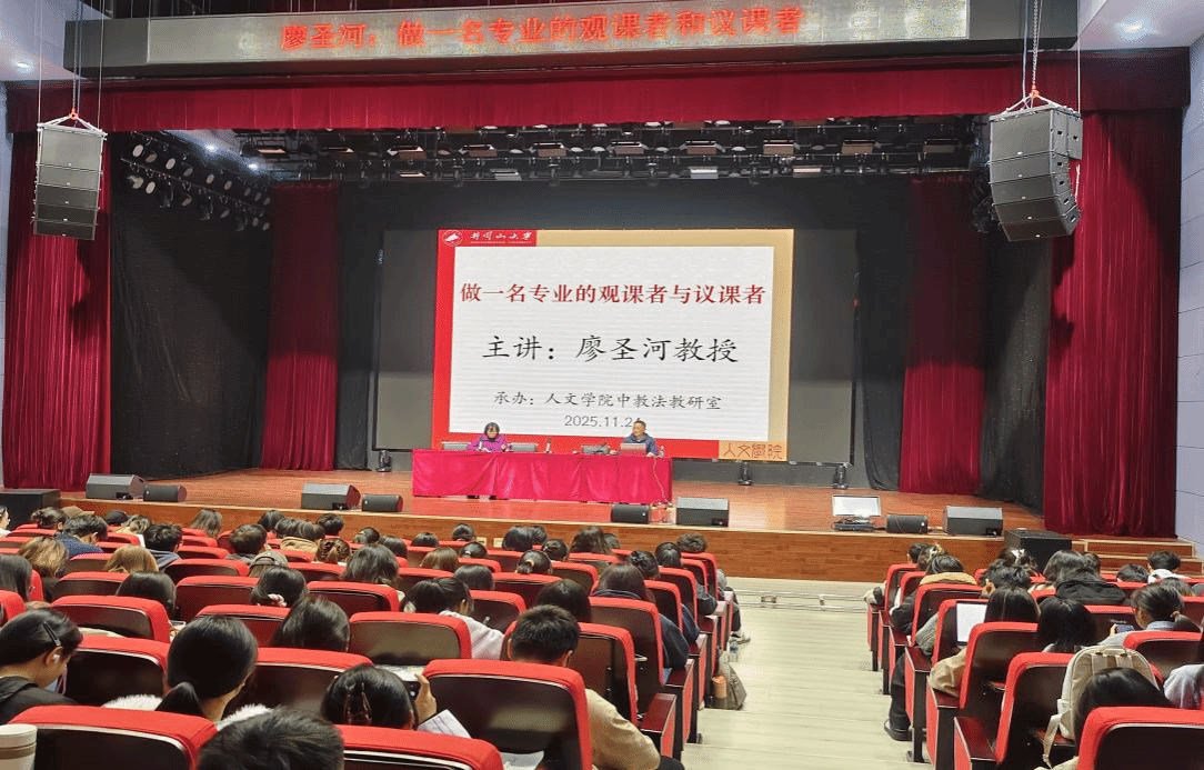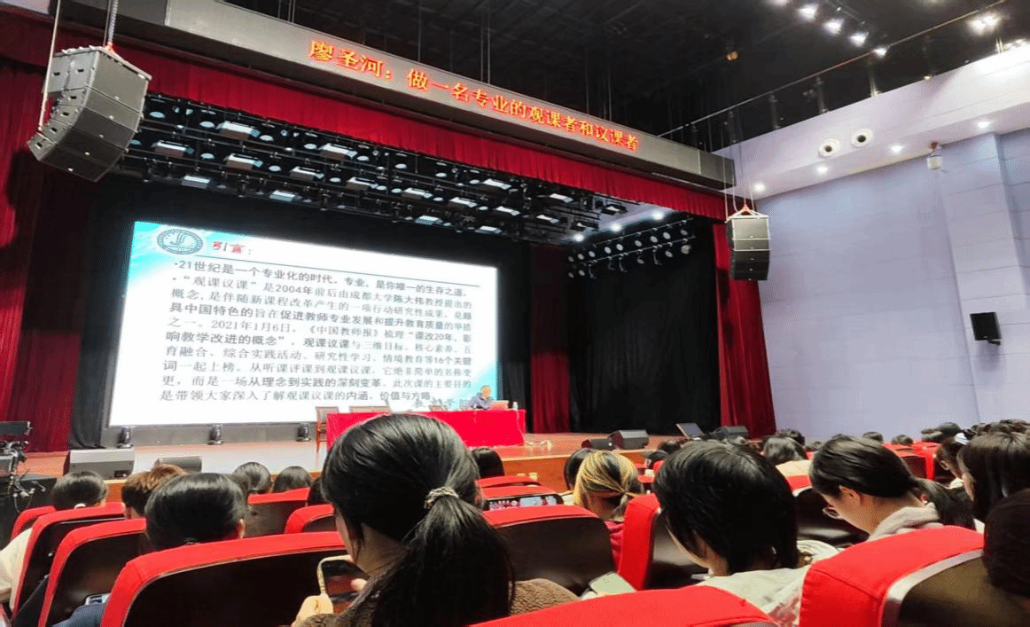 廖圣河教授首先阐述了从传统的“听课评课”表述转向“观课议课”的深刻背景与时代意义。他指出,这一转变不仅是术语的更新,更是教育理念从“评判”走向“对话”、从“管理”走向“研究”的革新。讲座中,廖教授系统深入地剖析了“观课”与“议课”的核心内涵、基本特点与多元功能,并结合自身丰富的教研与实践经验,详细讲解了专业观课与议课的具体内容、有效策略、规范流程及关键要领。廖教授不仅为在座师生系统地构建了专业观课议课的理论框架,更分享了许多落地有声的实践策略与生动案例。整场讲座内容翔实,逻辑严密,见解深刻。现场气氛热烈,师生们纷纷表示对如何科学、专业地开展课堂观察与教学研讨有了全新的认识和深刻的理解。