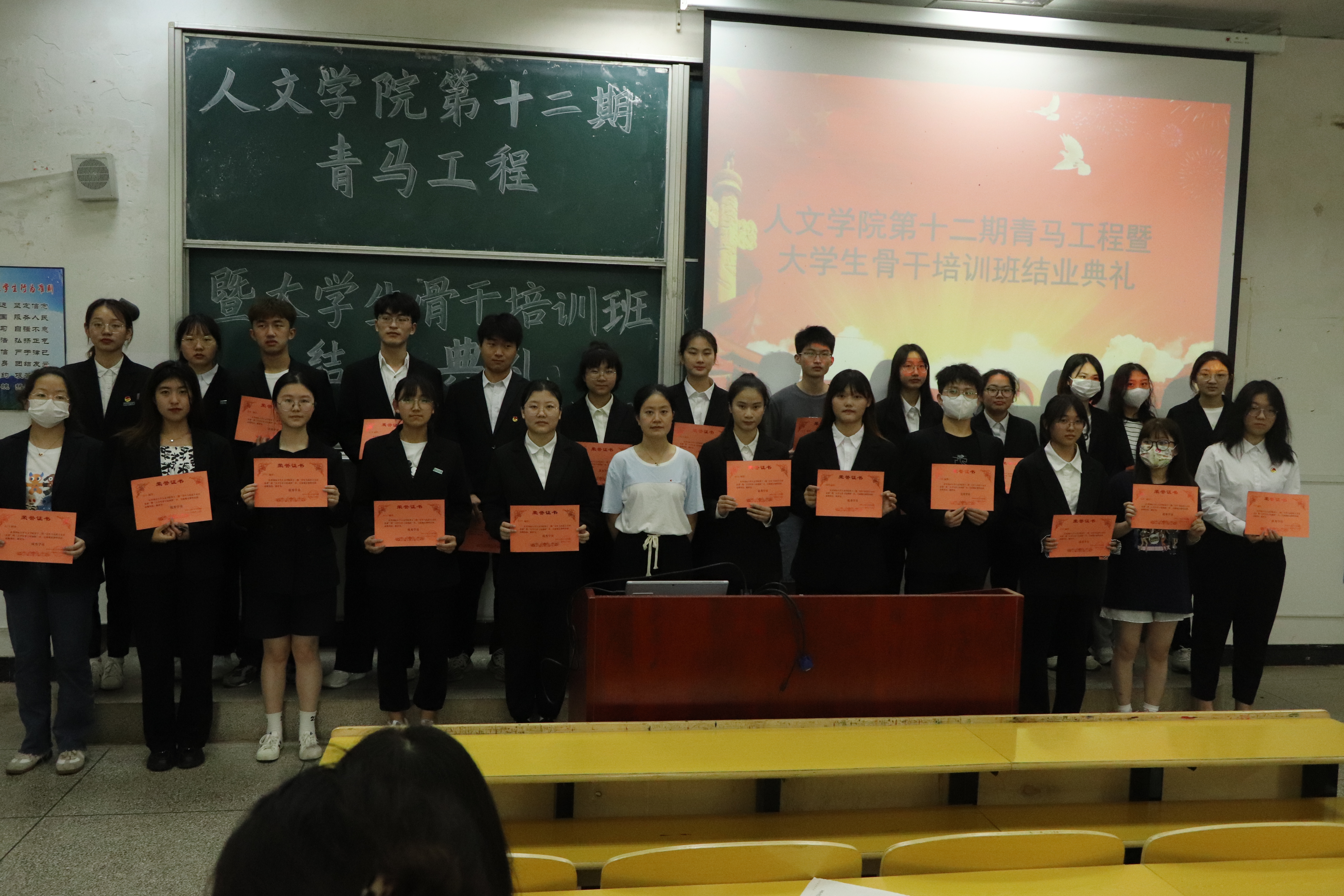 4月25日12时30分,人文学院第十二期青马工程——大学生骨干培训班结业典礼在5栋104举行。出席此次典礼的有学生会秘书长陈灵婧老师和大骨班全体成员。