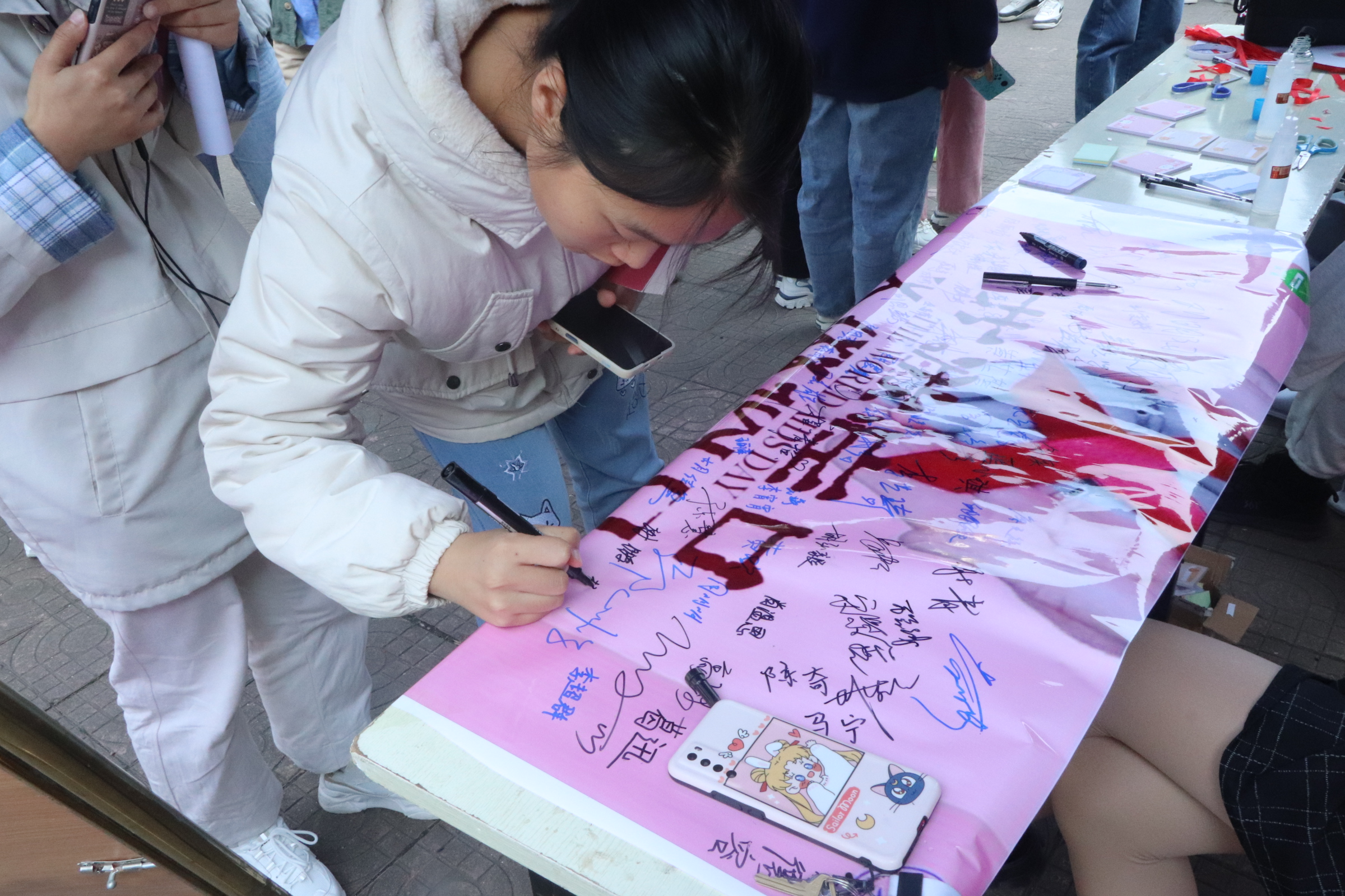 人文学院摆点处设置了四个趣味小活动。参与者可以在摆点处签字,或者用便签写下对艾滋病人的鼓励。尤为特殊的是设置了趣味抱抱活动,工作人员举牌“你好,我是一个艾滋病人。这个冬天,可以给我一个拥抱吗?”,起初,来往的同学看向工作人员但是犹豫着没有向前,但是在工作人员的鼓励下,有同学踏出第一步拥抱工作人员。随之而来更多的同学向前拥抱工作人员,这种方式从一定程度打消同学们对艾滋病的歧视,传递了日常接触不会感染艾滋病的知识。摆点摊位上还设置了手工制作红丝带的趣味小活动,红丝带是对艾滋病认识的国际符号,这一标志用来表示对艾滋病的关心。在制作过程中同学们了解到这一知识,并在制作完成后带走红丝带作为纪念。