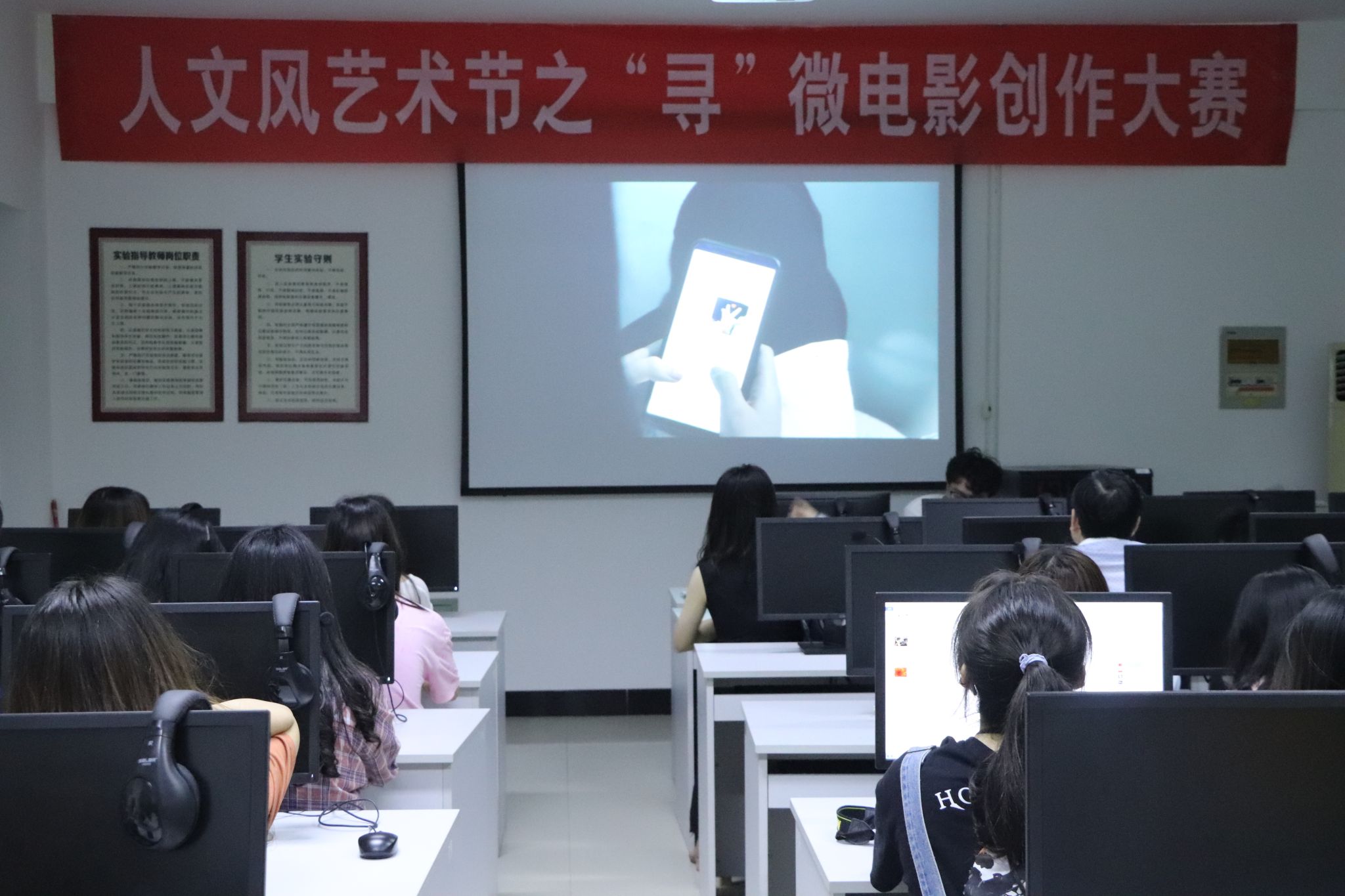 作品播放完后,评委老师对每部影片进行了点评。刘老师指出了其中的优点与不足,他说:“所有作品在没有老师的指导下独立完成,总体上还是不错的,但是从作品编辑和镜头运用等方面还是显得青涩……”
