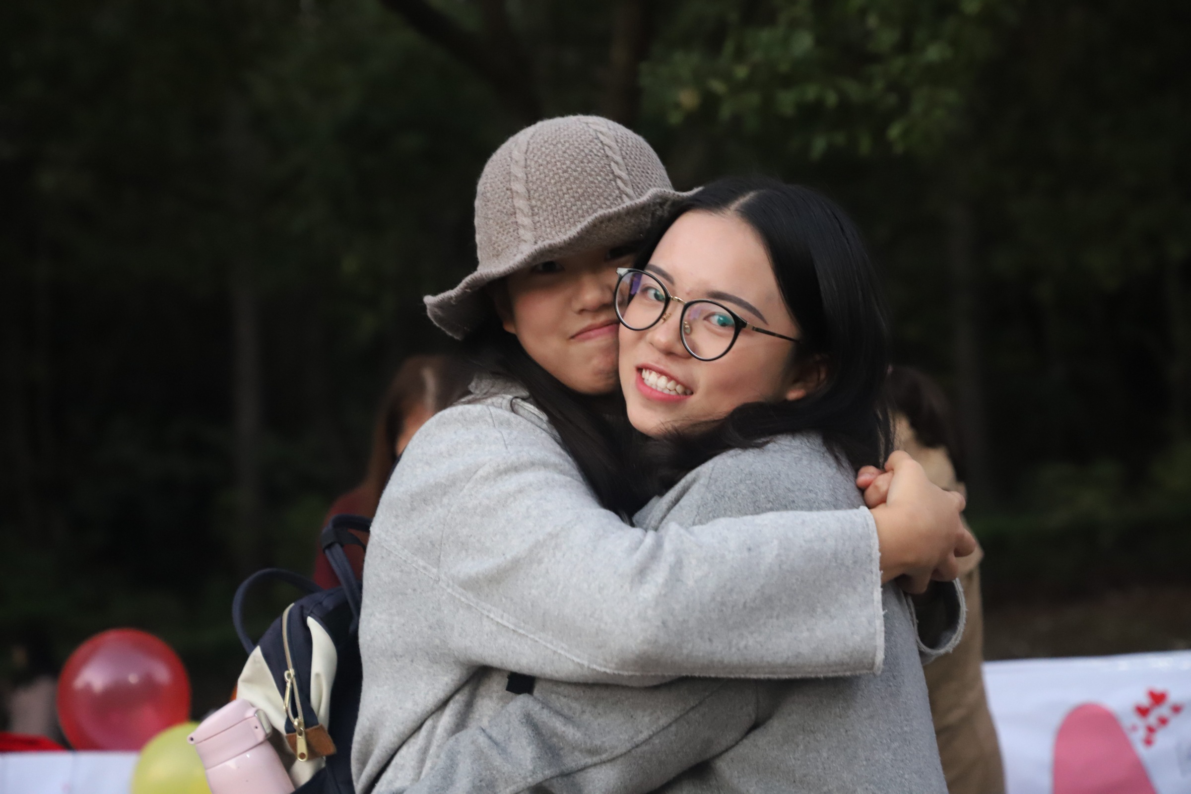 11时整,由社会实践部(爱心社)的成员和我院志愿者组成的有爱小队在一食堂门口摆点,吸引了许多下课的同学一起参与活动。 志愿者们带领经过的同学从爱心箱里抽取号码球,同学们根据号码球所对应的任务去拥抱他人,并在便利贴上写下自己的美好祝福。号码球所对应的任务有“拥抱穿红衣服或蓝衣服的陌生人”、“拥抱离你最近的人”、“挑选志愿者拥抱”、“自主选择拥抱一个人”。在这个过程中,有爱心社的成员和17级辅导员郭若虹老师拥抱,有两个素未相识的陌生人紧紧的拥抱在一起,还有忙碌的考研学子也参与进来......他们每个人都在传递着一份又一份温暖,增进着彼此的交流与了解。