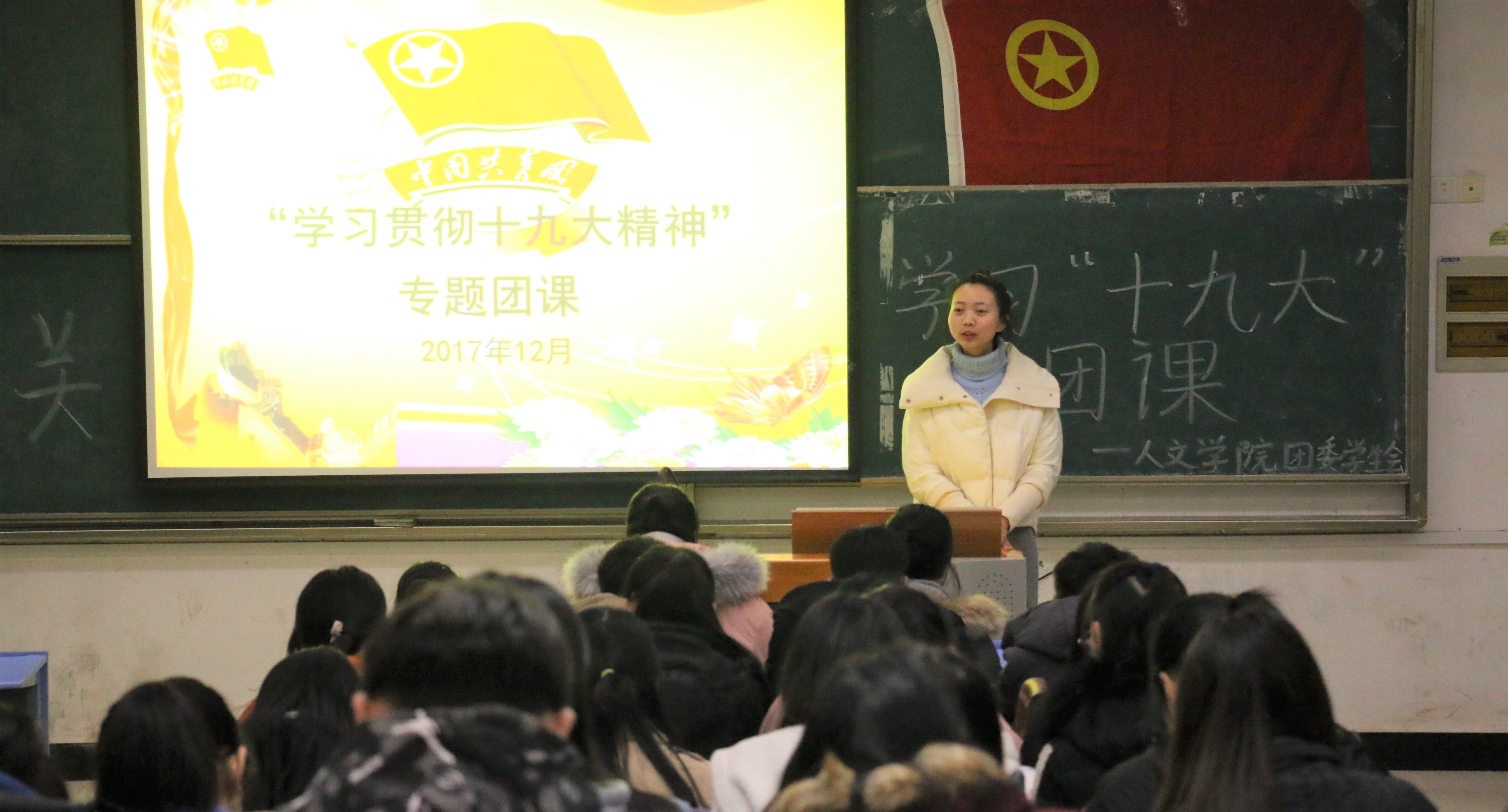 本次专题团课活动由团委负责老师戴梦雅主讲,以“学习贯彻十九大精神”为主题,17汉本一班、新闻班、编导班共计140余人参加了此次活动。