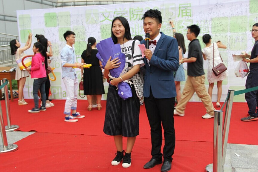 在本次晚会正式开幕之前,特别设定了一个场外“走红毯、签名留念”环节。全体11级的学子走上红毯,并在签名墙上写下自己的名字,学院领导及老师也在上面签下了自己的名字,并在镜头前留下对11级毕业生真挚的祝福。晚会正式开始前20分钟,学子们都已入座,毕业开场视频伴着轻柔欢快的音乐放映。当11级各班的照片出现时,现场掌声不断,欢呼迭出,毕业学子们为曾经的美好而兴奋。