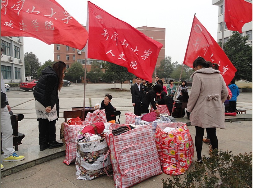 12月15日10:00左右,九栋教学楼前的圆盘四周挤满了人,院旗招展,宛如寒风中一团热烈燃烧的火焰。各学院为响应校维保部和江西省交通广播举办的“衣旧唤心”公益活动而正在积极整理同学们献来的爱心,其中最惹人注意的是我院中文系学生党支部募集的衣物——多达十一大包!