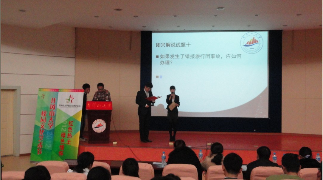 为弘扬井冈山精神,传播庐陵文化,丰富井大学子课余生活,营造浓郁的校园文化气氛,12月14日星期五晚7点,“革命摇篮,生态家园”导游词中文解说大赛在10栋学术报告厅举行。担任本次比赛评委有商学院学生科副科长黎明辉老师,导游专业老师张悦、余涵、刘锦云、李冬影。我院李佳参加了本次比赛。