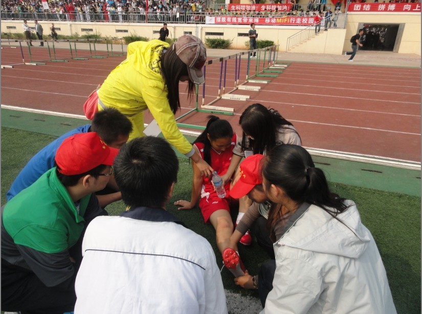 我校第六届田径运动会在礼炮声中拉开了序幕,于其首日比赛,女子100米栏预赛第三组中,我院女运动员12级新闻班徐淼在跨越第五个栏时不幸摔倒在地,最终因脚腕扭伤,未能把比赛完成。