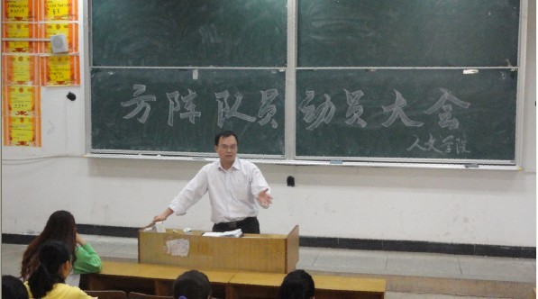 欧阳书记率先发表讲话,他针对目前的训练状况要求大家提高认识,高度重视,抓紧时间,认真投入,精心组织,展示我人文学院的亮丽风采。