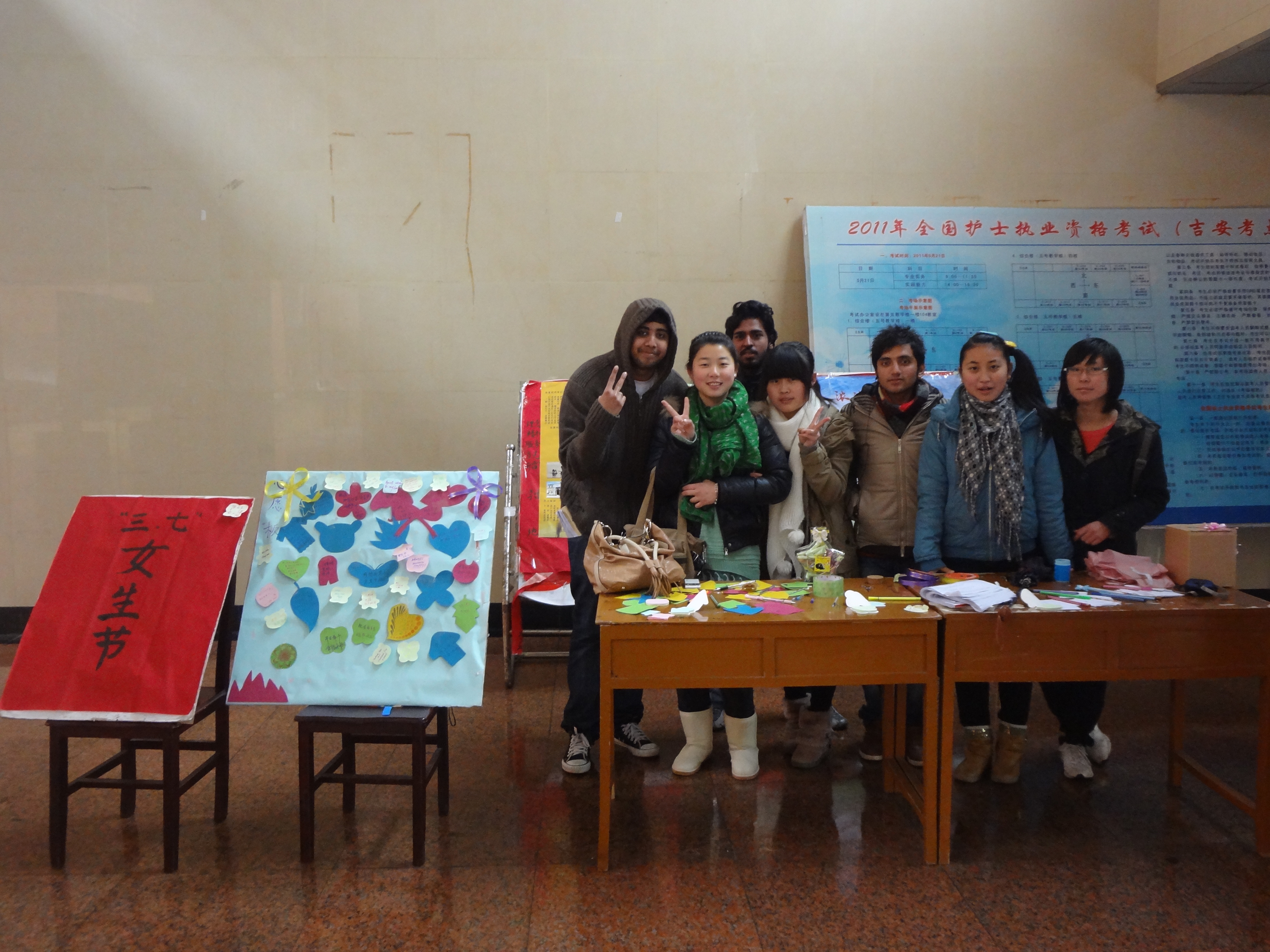 上午第二节课后,五栋大厅忽然出现的彩纸和一块块展板让过往学生频频驻留。女生们用笔在便利贴上写下了心愿,不少男生则被展板中的诗词所吸引。一群外国留学生充满好奇的向工作人员询问“三七节”是什么,并参与到活动之中。