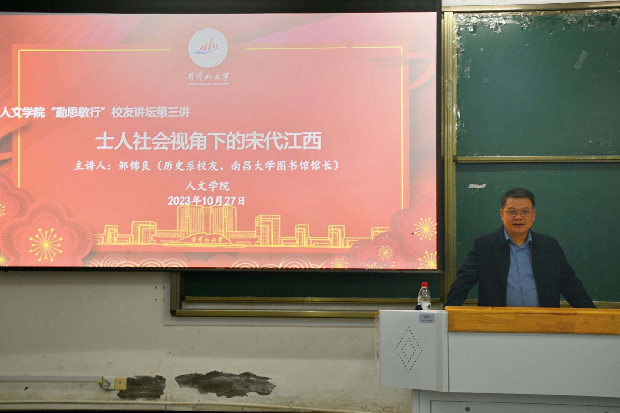 10月27日19时,人文学院“勤思敏行”校友讲坛第三讲在11栋机电建工楼B104教室如期进行,本次讲座的主讲人为我校知名校友、南昌大学历史系教授、博士生导师、南昌大学图书馆馆长、江西省政协常委以及江西省宋史研究会会长邹锦良,参加本次讲座的有人文学院院长龚奎林、历史系主任李伏明、历史系教师张永建、张春芳、曹万青以及井冈山大学附属中学教师刘娟和人文学院部分学生200余人。