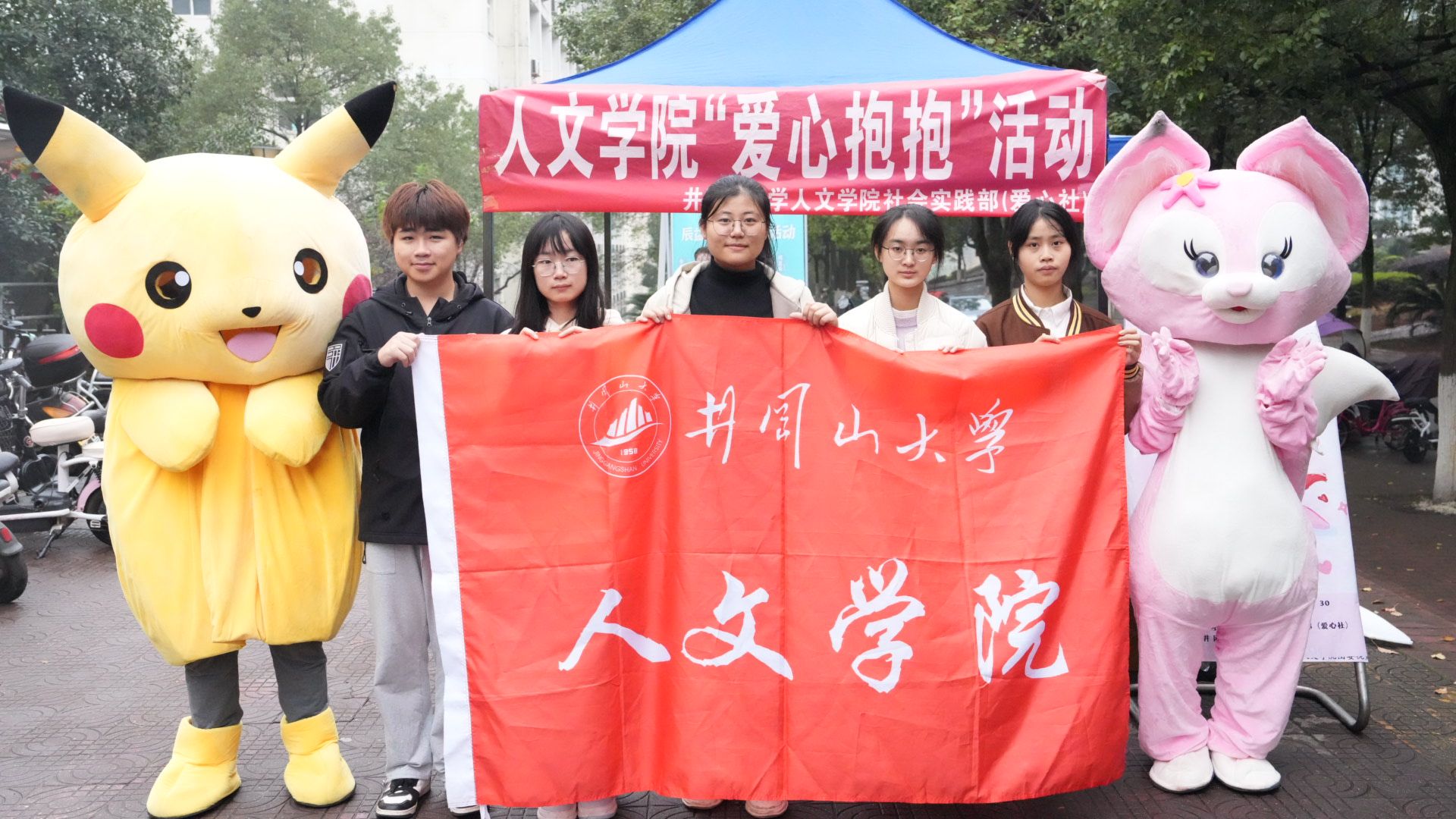 活动中,志愿者穿上各式各样的玩偶服,在校园内流动,通过一个拥抱或是一个招手,引导井大的师生与玩偶拥抱,给互动者带来一份臂膀的温暖,以此让友善和温暖传播到校园的每一个角落。