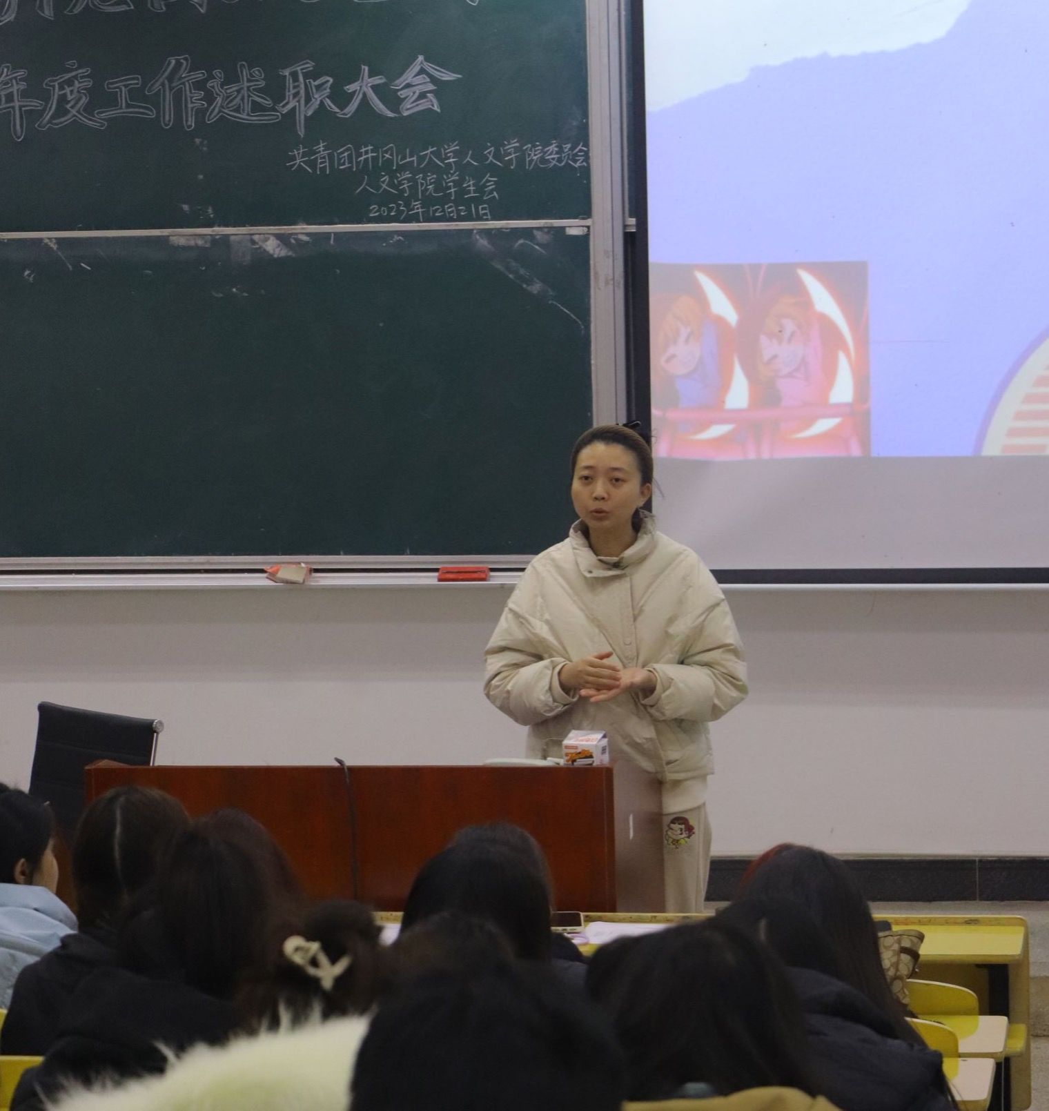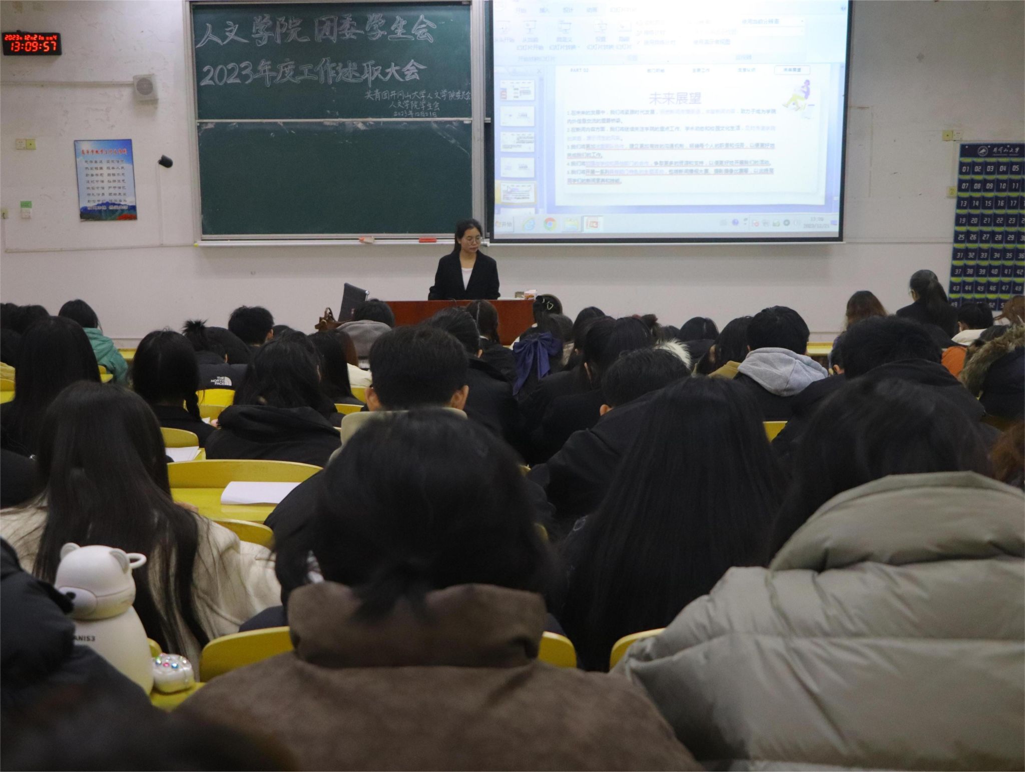 为做好总结并在在来年能够更好地开展工作,人文学院团委学生会于12月21日在五栋104教室召开2023年度述职大会。团委书记戴梦雅出席,主席团成员、部门负责人及工作人员共计141人参加,会议由主席团成员顾冰洁主持。