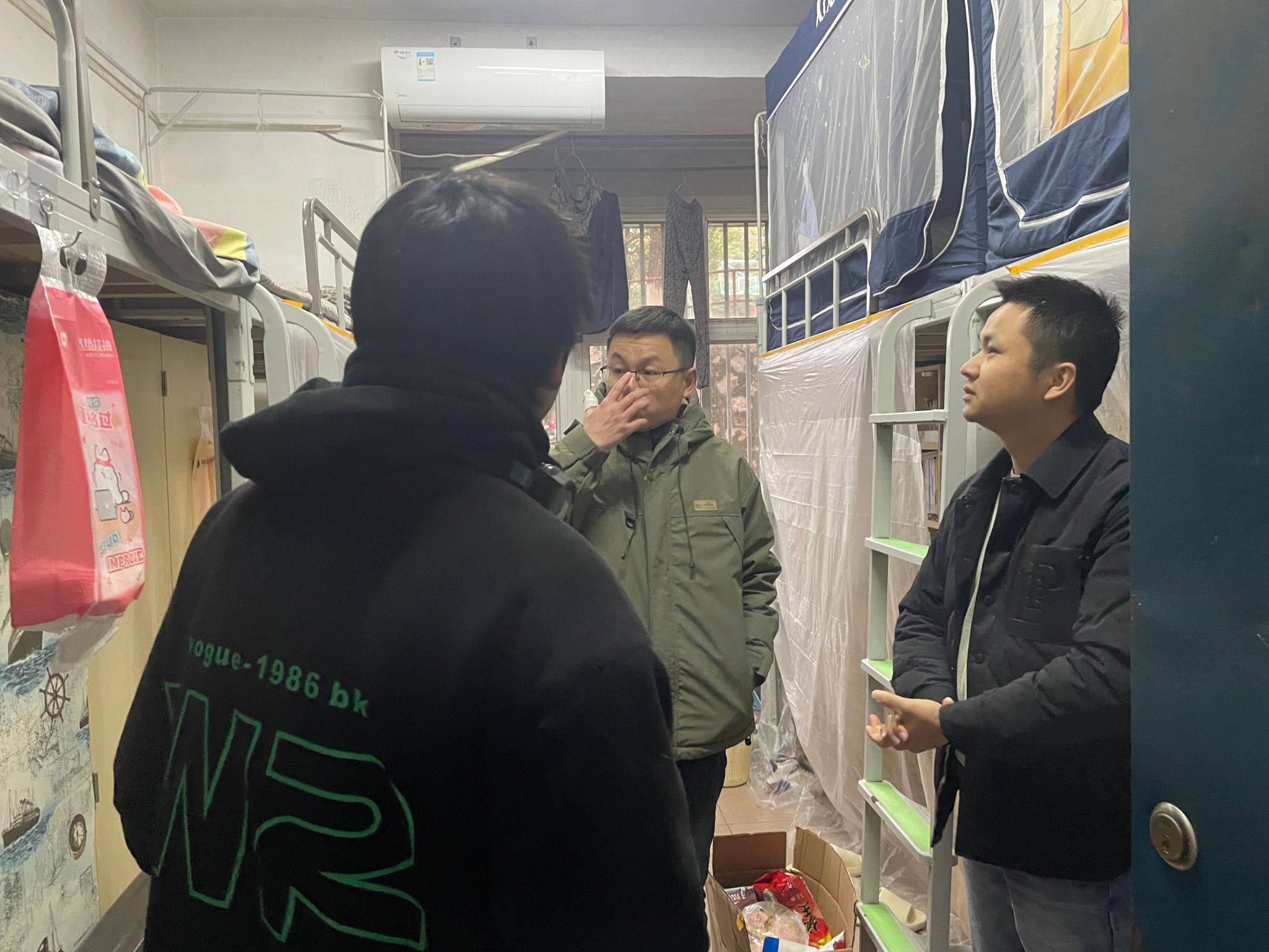 在走访过程中,老师们一一查看了宿舍的设施、设备的运行情况、卫生状况,检查是否有违规电器的存放和使用,其他安全隐患排查工作主要包括检查床铺、爬梯、桌椅、门锁等基本设施是否出现松动、损坏的情况,宿舍是否有违规加装和改装等等。老师们在宿舍与学生进行亲切交谈,关心了学生的学习、生活近况,回应了学生关切的问题,与学生一起排查用水用电和基础设施的安全隐患。同时再次重点强调了消防安全、校内交通安全、注意防范电信网络诈骗和提高爱校荣校意识。