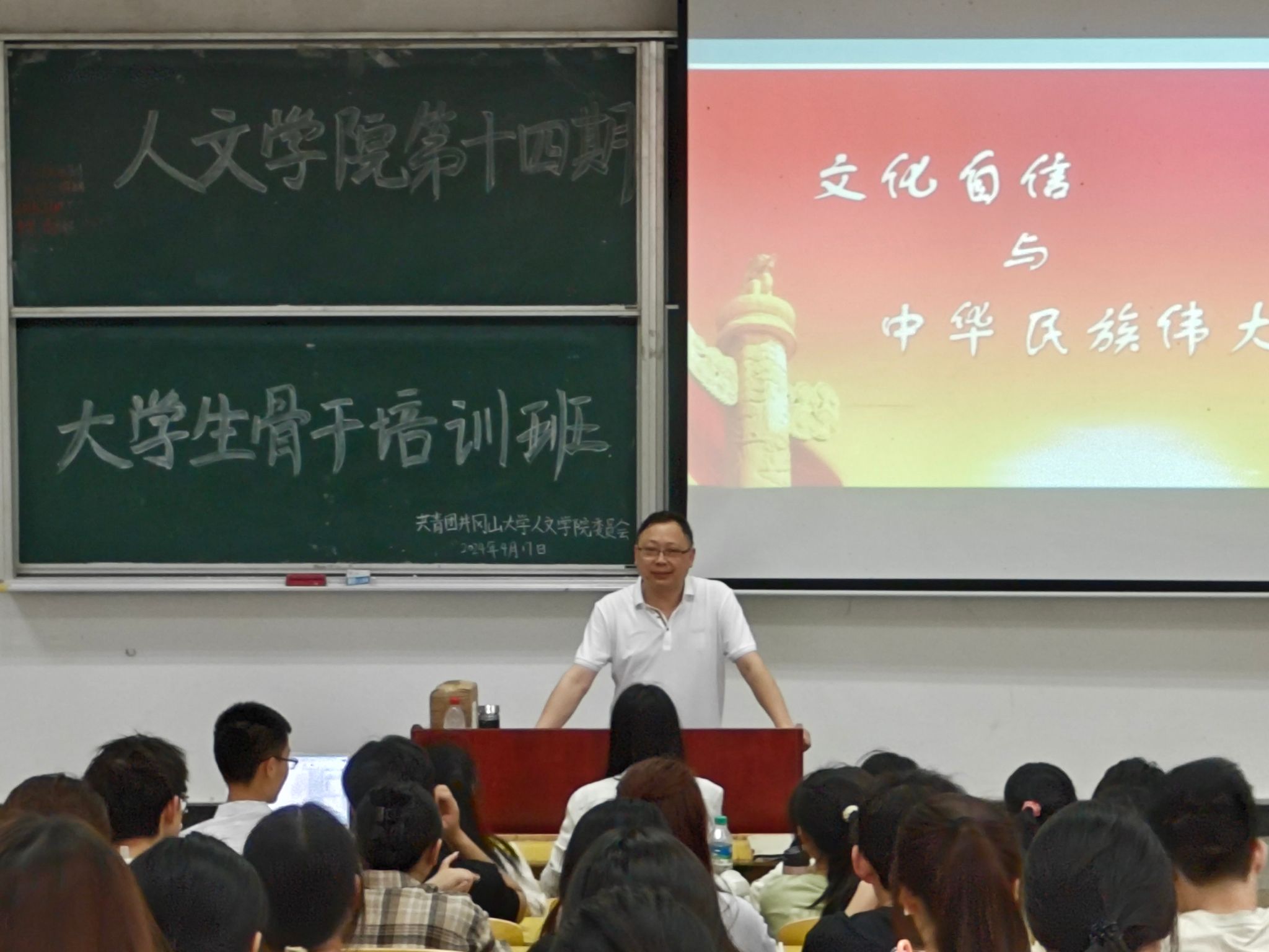 为增强学员对中华优秀文化的自豪感与认同感,助力建设社会主义文化强国,4月17日,人文学院大学生骨干培训班邀请学院副院长邓声国带来以“文化自信与中华民族伟大复兴”为主题的第四次授课。