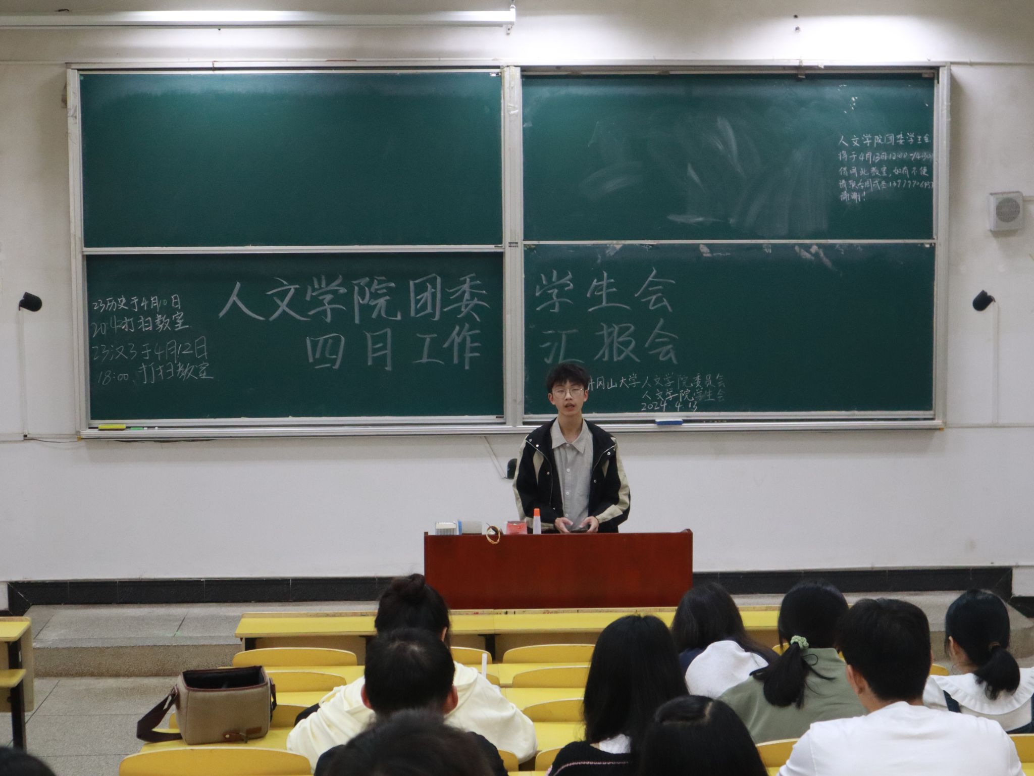 为了促进学院团学工作顺利进行,更好地让团委学生会各部门进行工作方面的查漏补缺。人文学院于2024年4月13日中午在5栋105教室开展人文学院团委学生会四月工作汇报大会,校学生会成员、人文学院团委学生会各部门负责人及部分工作人员参加会议。