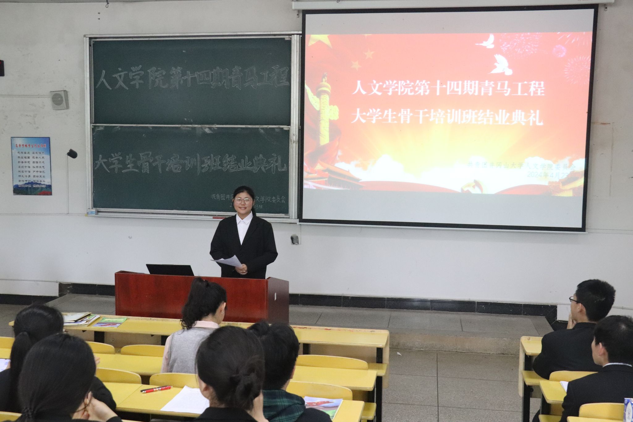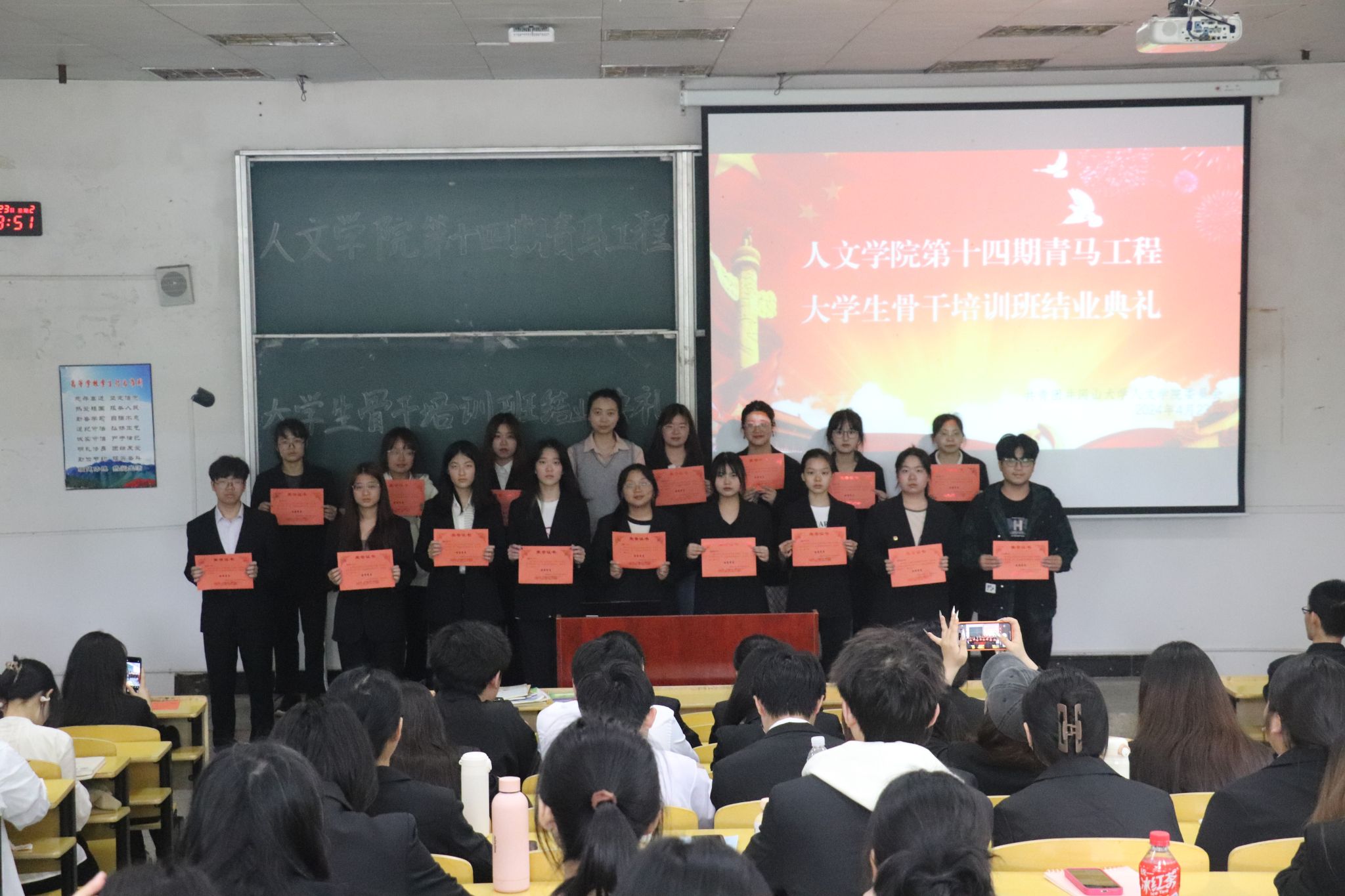 4月23日人文学院第十四期青马工程培训班结业典礼在五栋104教室举行,人文学员团委书记戴梦雅、青马工程培训班全体学员参加了此次活动。