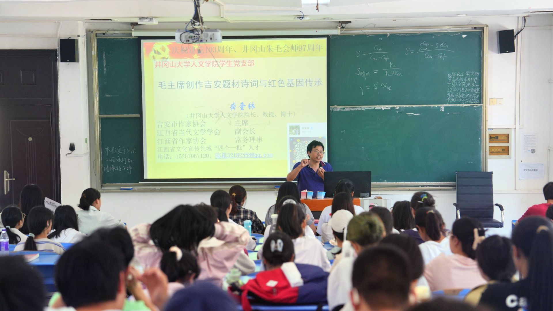 在讲课中龚奎林解析了毛主席的诗词,特别是吉安题材诗词中的深刻内涵和时代价值。他强调,毛主席的诗词不仅具有高度的艺术价值,更蕴含着丰富的思想内涵和崇高的理想信念,对于大学生的成长具有重要的指导意义。