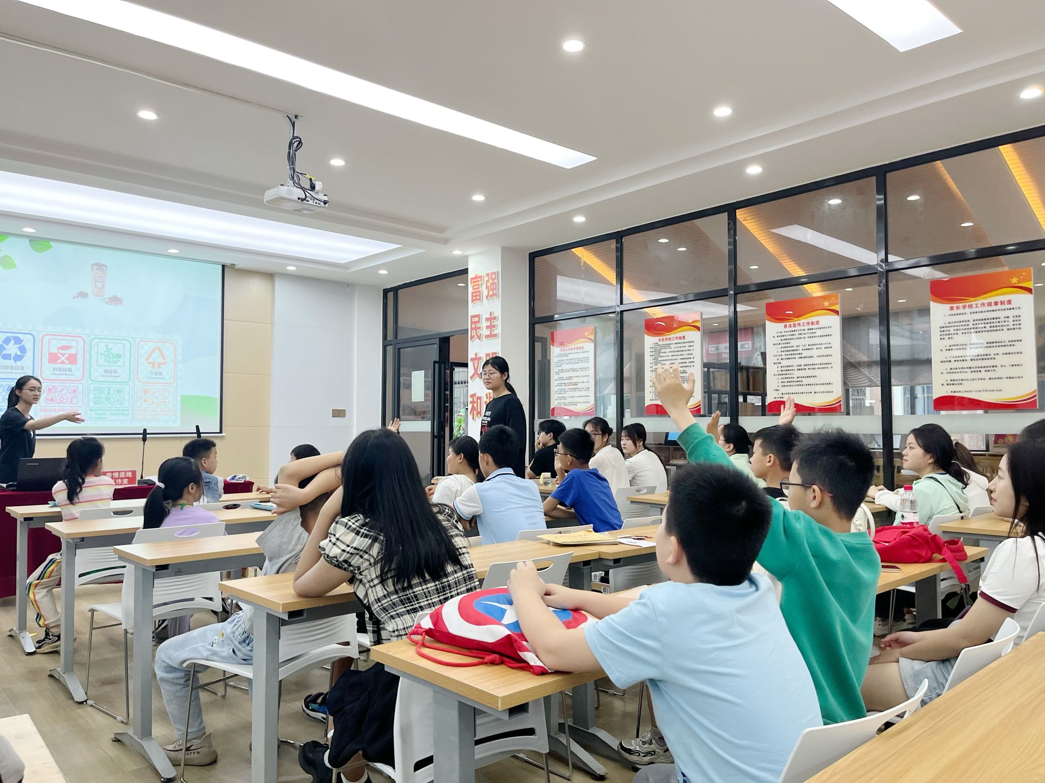 活动总共分为三个板块,首先宣讲志愿者采用多姿多彩的图画和生动的视频来讲解地球为什么会受到伤害以及如何关爱地球。随后寓教于乐的垃圾分类小游戏让孩子们沉醉其中、欢欣雀跃。最后举行了环境保护板报设计活动,志愿者和孩子们一起耐心完成作品,呼吁全社会树立关爱地球意识,争做地球母亲“代言人”。